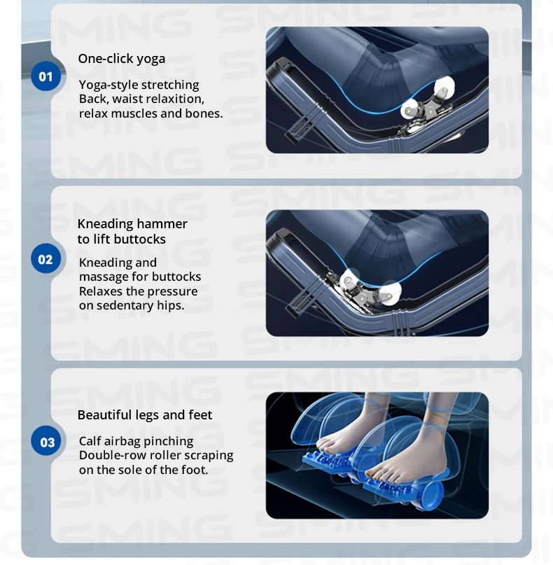 The whole body is wrapped and kneaded with larger airbags, like the waves of the sea, layer by layer pushing and pressing