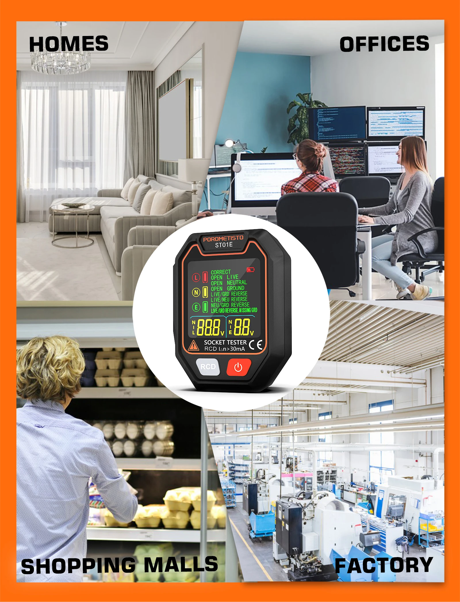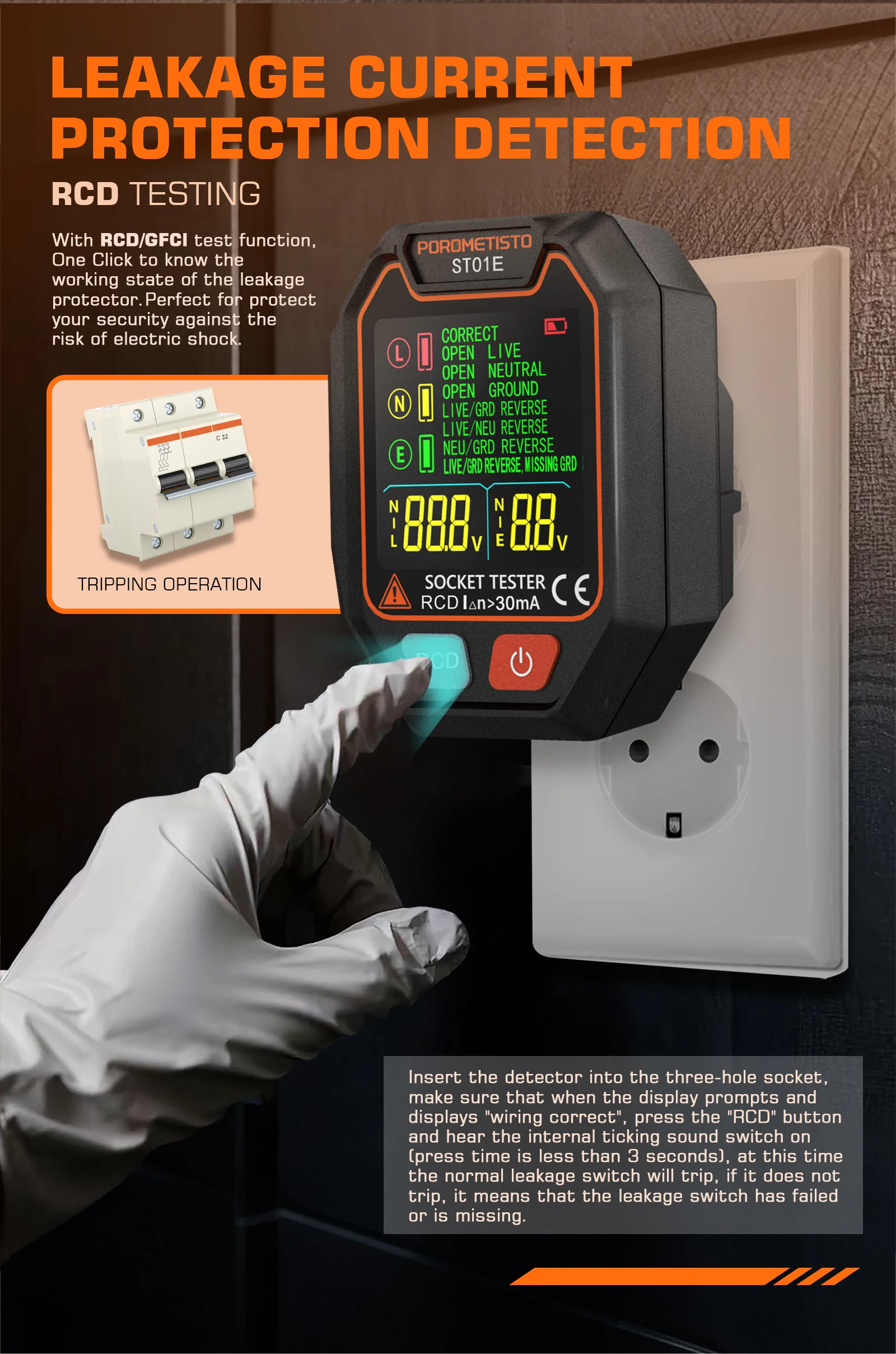 POROMETISTO ST01 Socket Tester Pro Voltage Test 30mA Socket Detector US/UK/EU Plug Ground Zero Line Plug Polarity Phase Checker