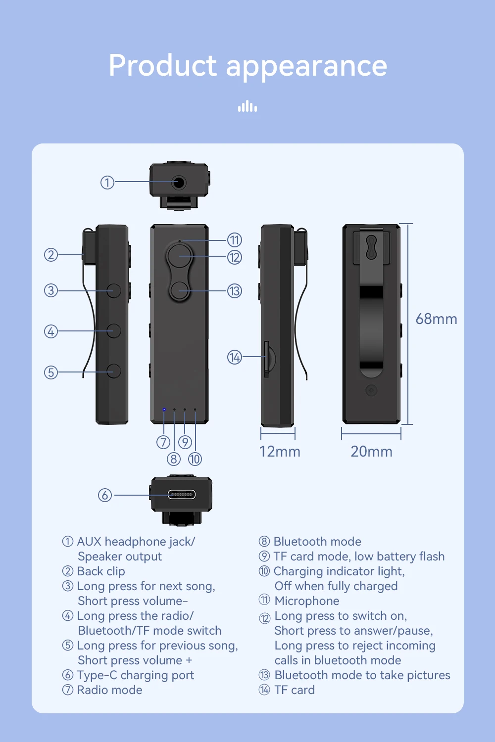 4. Secure Clip Design: The radio speaker is equipped with a highly elastic clip that securely attaches to clothing, providing stability during movement. With its low power consumption and a large capacity 200mAh battery, you can enjoy music for extended periods.