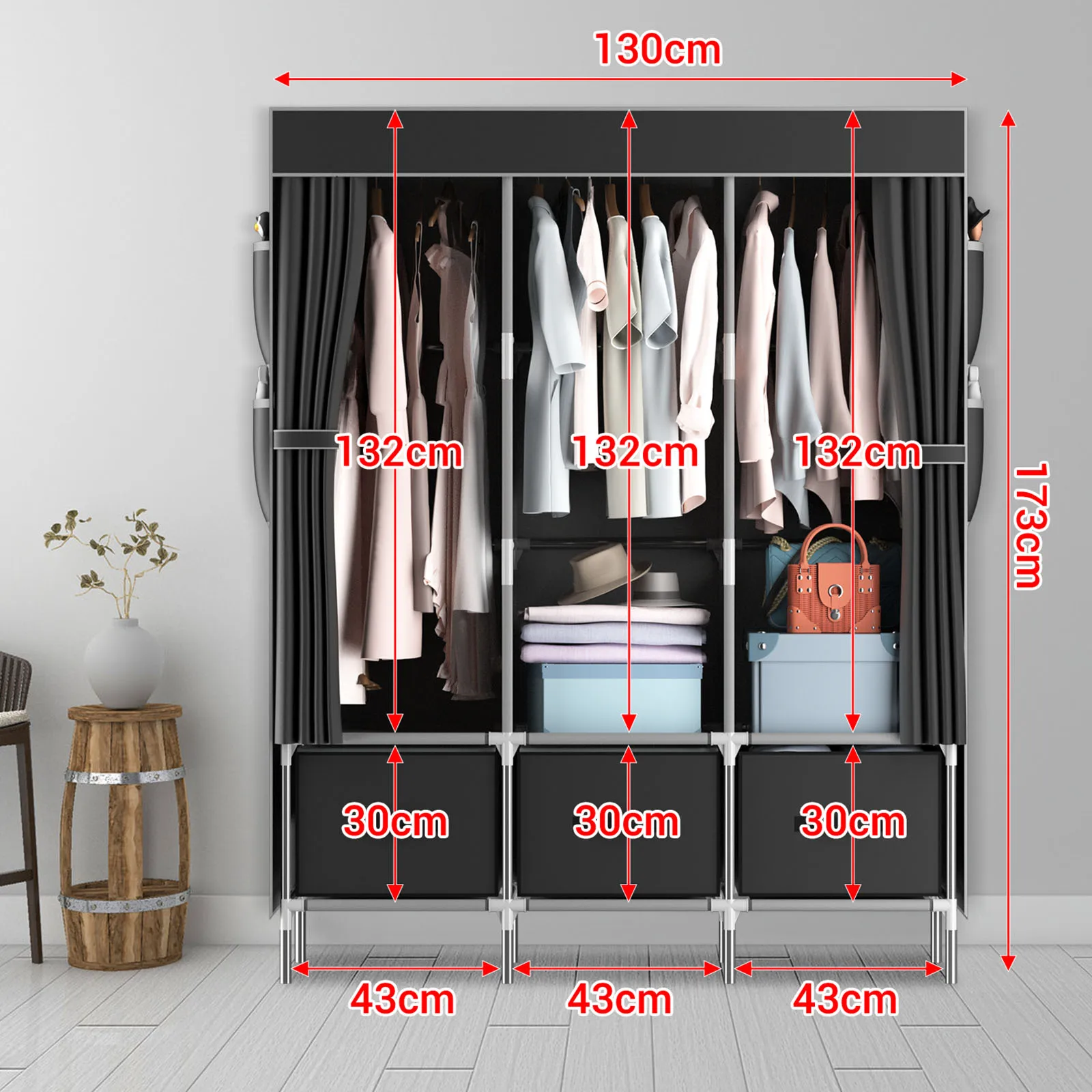 Portable Canvas Wardrobe, wardrobe Pop up wardrobe, Versatile Fabric Wardrobe with 3 Storage areas and 3 Hanging Rail 8 Side Bag