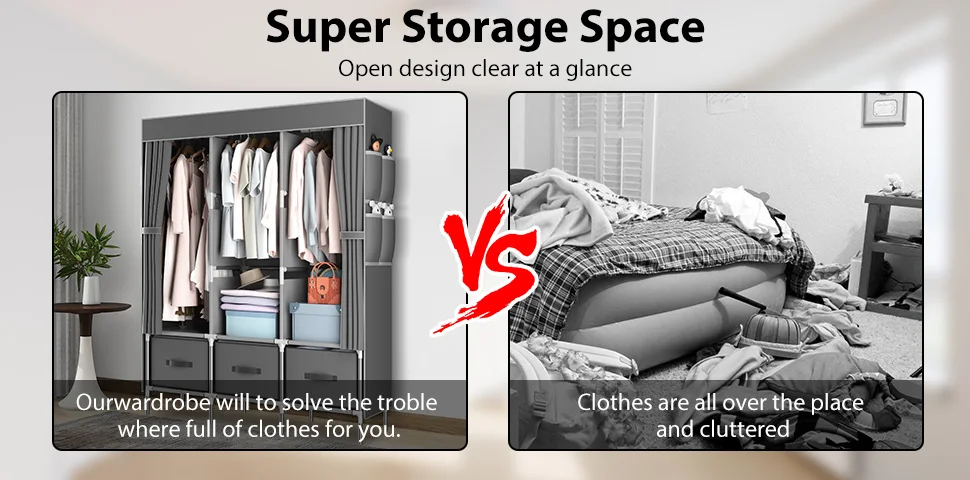 【Product upgrade】By increasing the diameter of the metal tubes to 16 mm, the structure of the portable wardrobe becomes more stable and resistant. In addition, the cover of the wardrobe has been upgraded to a thickened non-woven fabric cover, which is waterproof, durable and easy to clean.