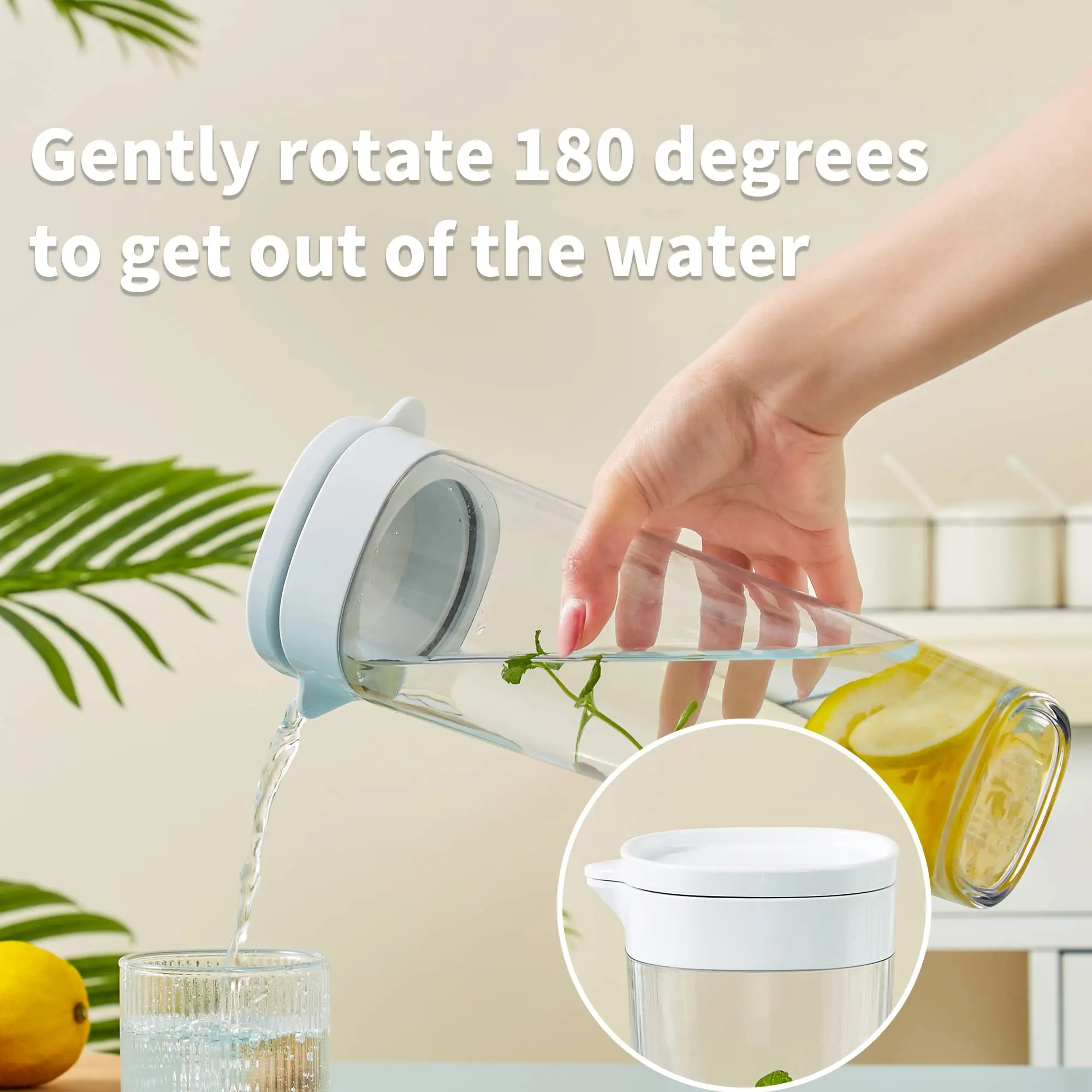 ⭐ 【LARGE CAPACITY WATER PITCHER】:1100/38oz,large capacity water pitcher enough for your family daily juice container or entertain guests at the party.Size: height-26.7cm/10.5inch,bottom diameter-7.1cm/2.8inch,lid diameter-9.4cm/3.7inch.With plastic pitcher slim shape,the water carafe fits easily on the refrigerator shelf or the side door.