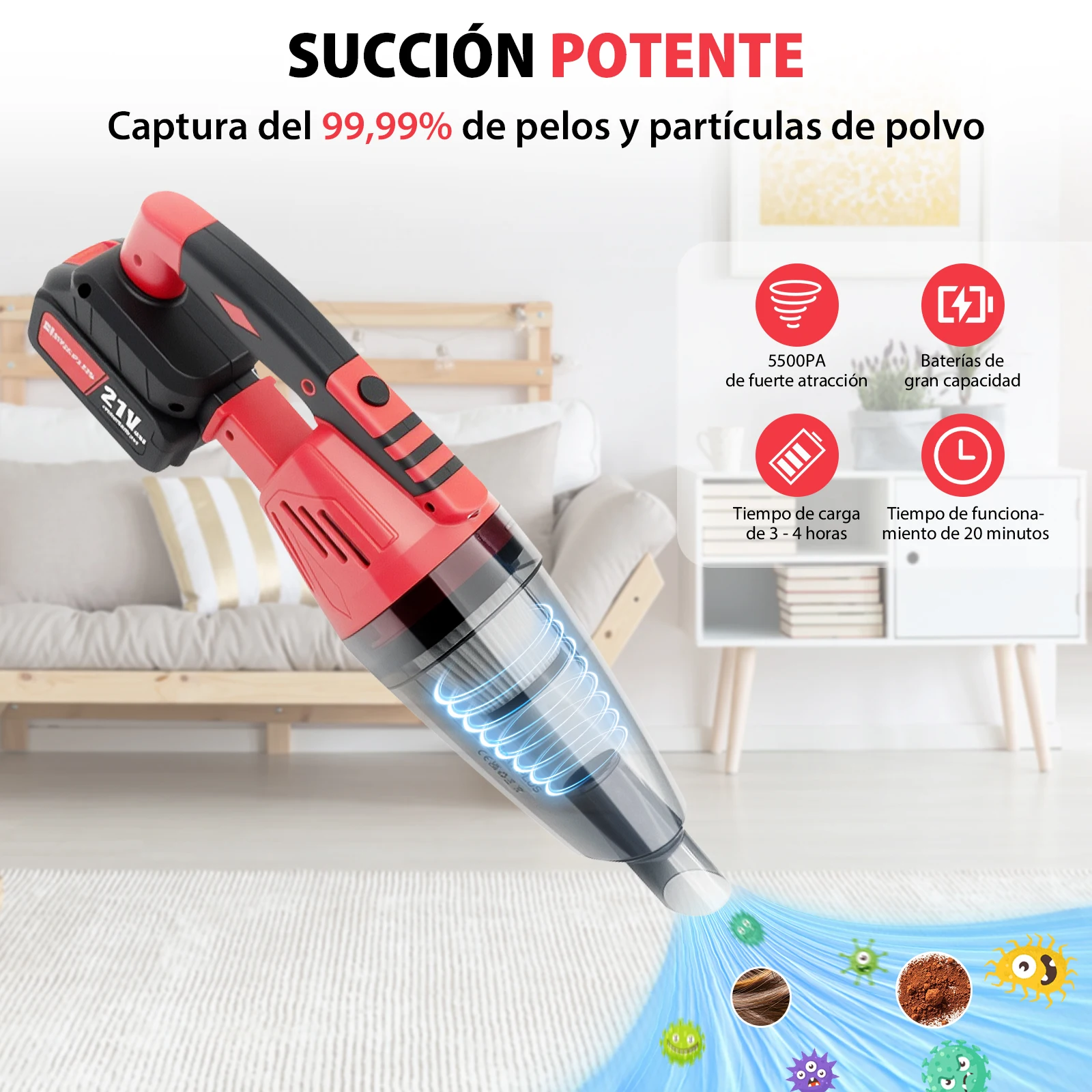 【Strong Suction& Large Capacity Battery】Vacuum cleaner features a powerful motor with strong suction, household vacuum cleaners can easily complete deep cleaning for carpets, hardwood floors, and pet hair. Equipped with Large-Capacity Batteries and Super Fast Charging, the long runtime of this vacuum cleaner carpet can meet your daily cleaning needs perfectly.
