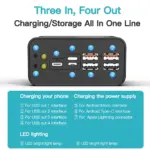 2. 4 USB output ports(USB A), 3 input ports (For Lightning+Micro USB+TypeC)
