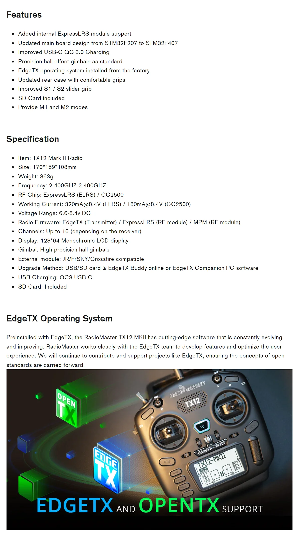 Upgrade Method: USB/SD card & EdgeTX Buddy online or EdgeTX Companion PC software