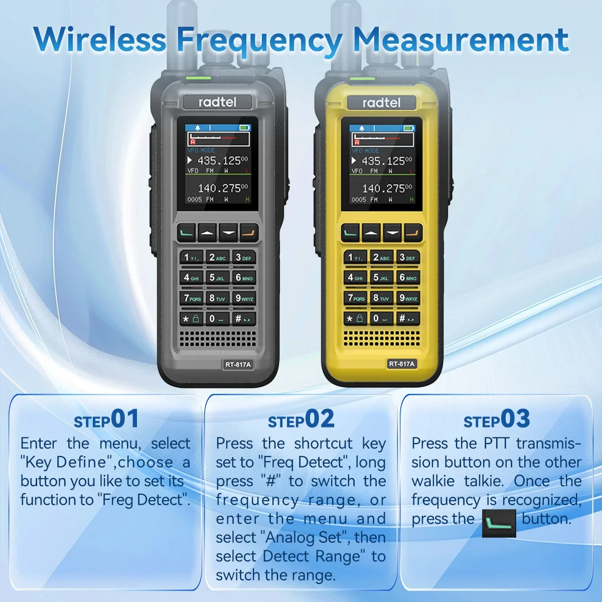 Press the menu button to enter the menu interface, select “Key Define”, and customize a shortcut function for a button based on your usage preferences as “Freq Detect”. Then press the shortcut button to decode with one click and quickly match the frequency. Two walkie talkies can communicate normally and smoothly.