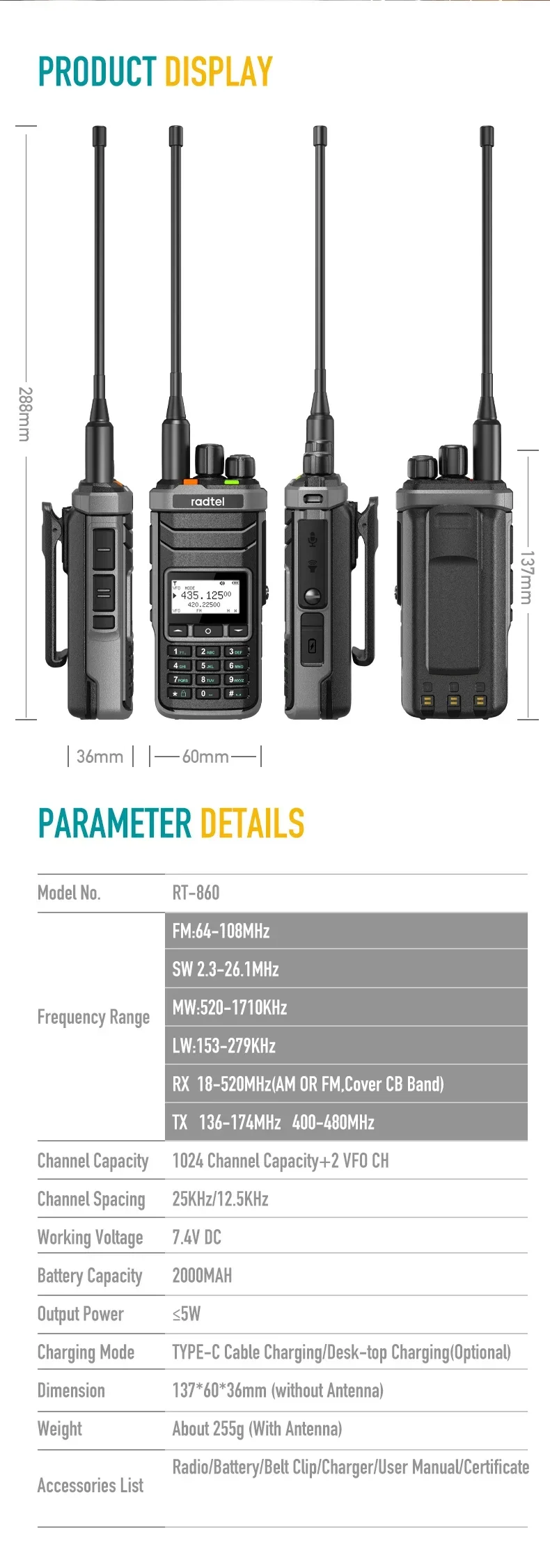 - Modulation: AM/FM/SW/MW/LW/CB/SSB