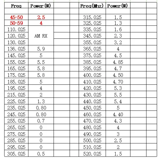 List of sample output power: