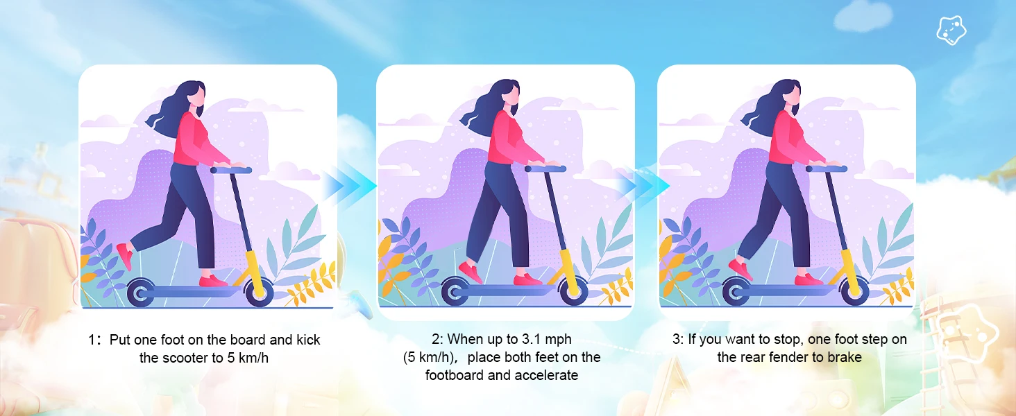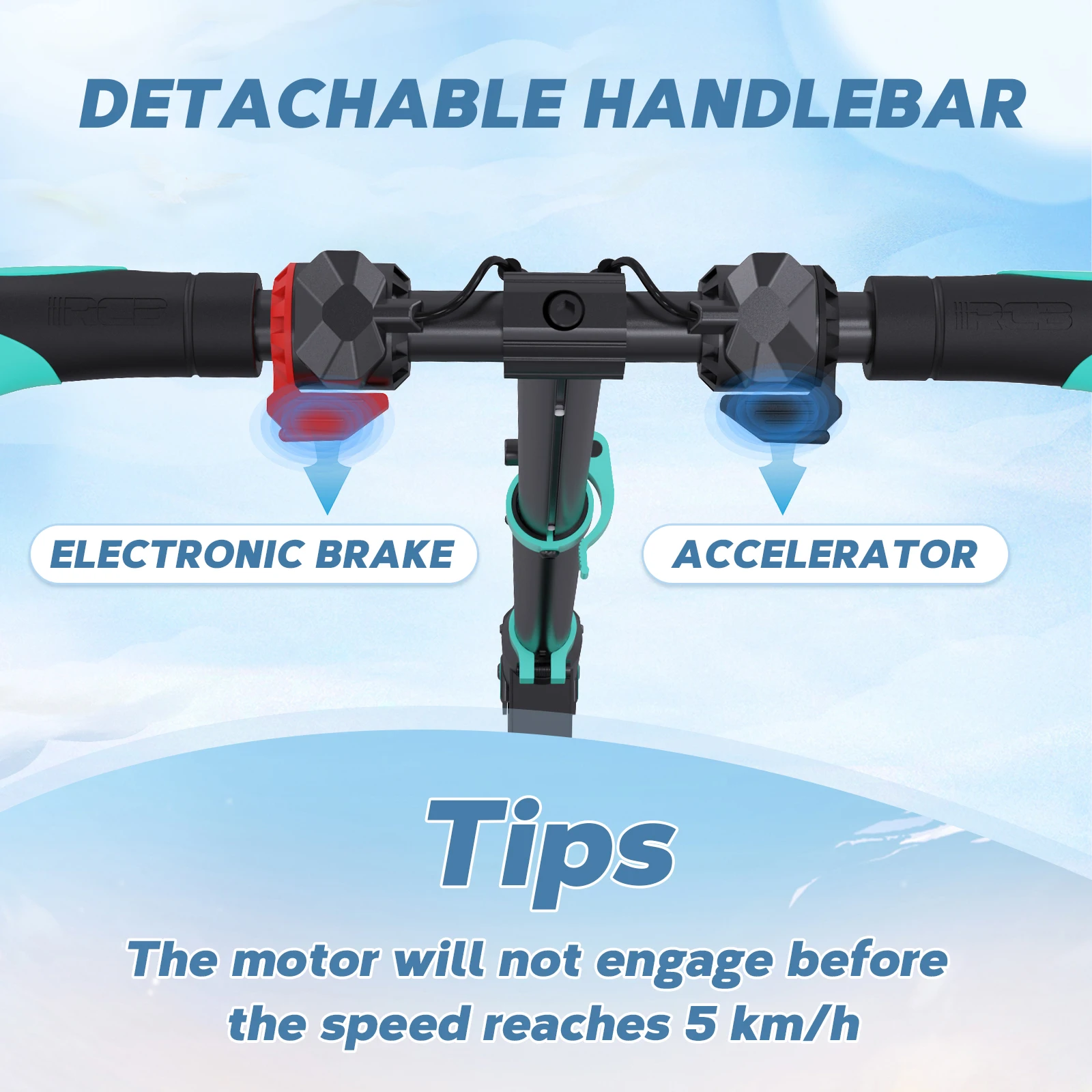 【NON-ZERO START】 Quickly press the power button five times after POWER ON to switch between ZERO START and NON-ZERO START. Equipped with a safe non-zero start function, specially designed for children to avoid accidental touch. After power on, this kids electric scooter must be traveling at least 3MPH(5KMH) to activate the motor