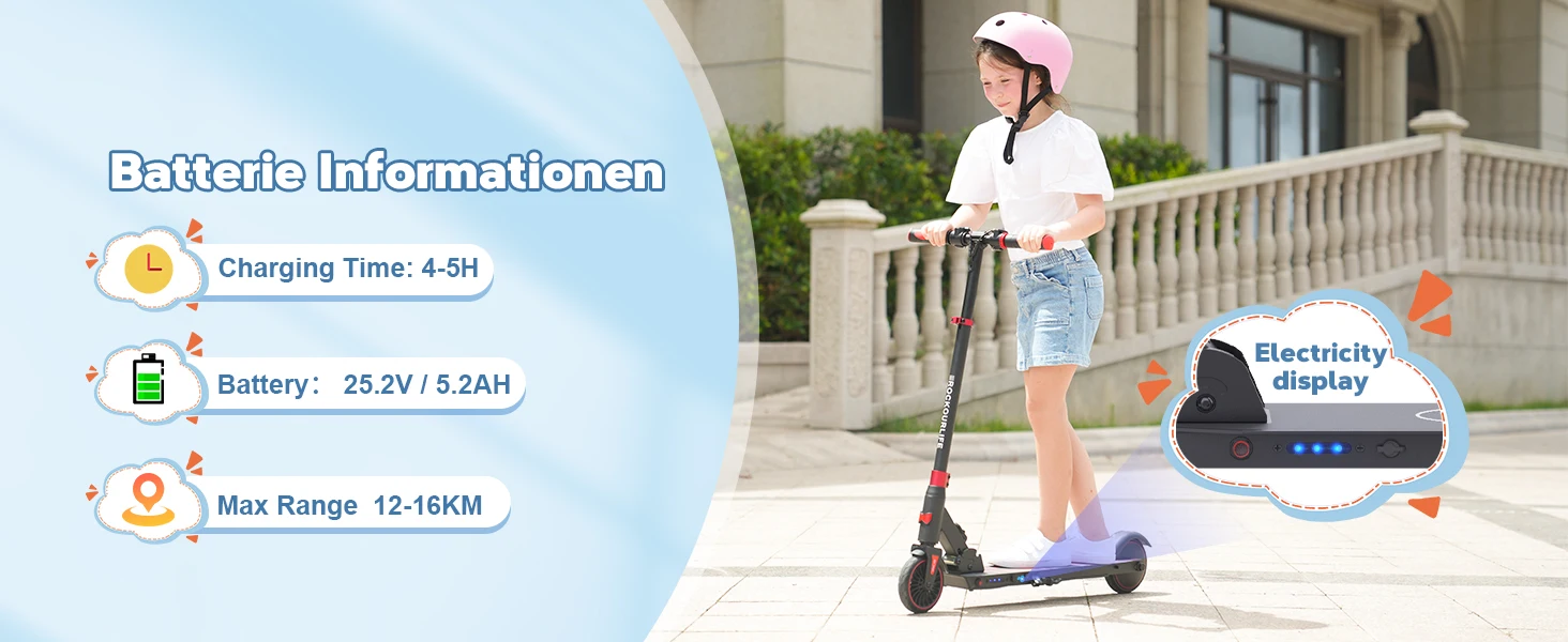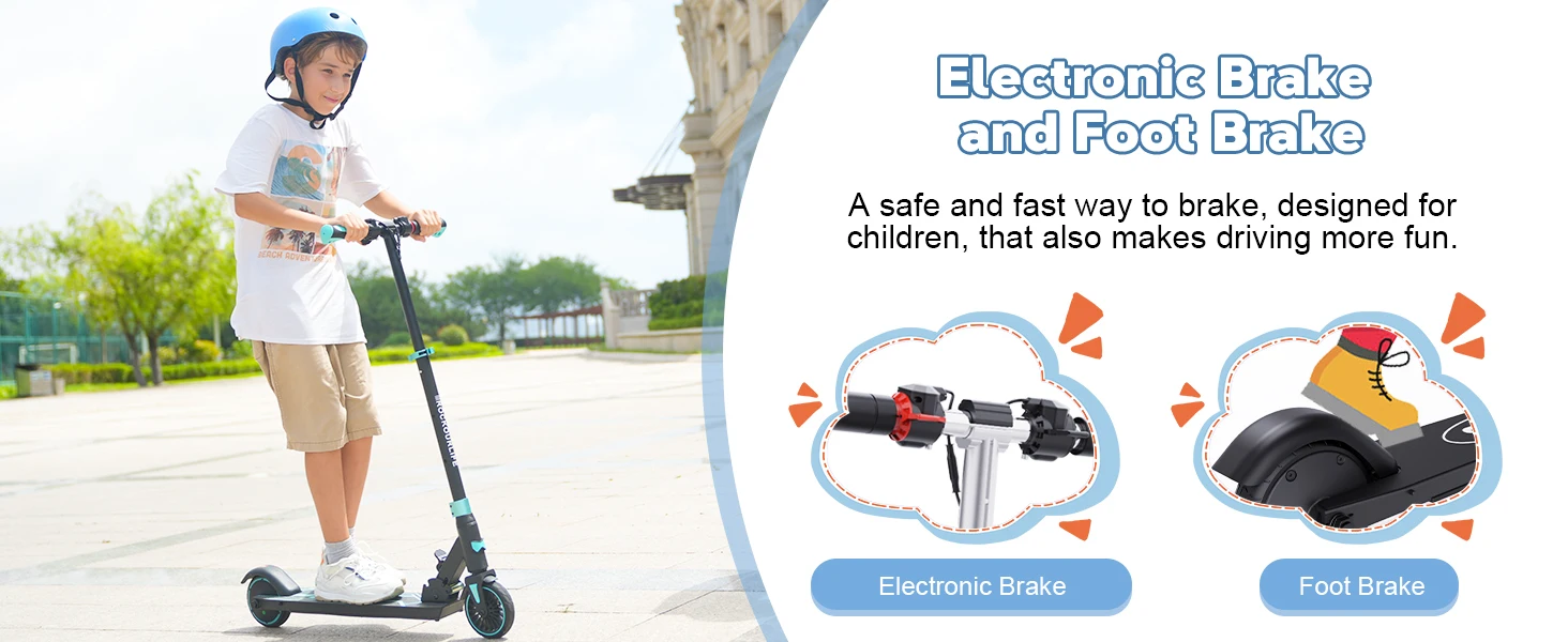 【SAFE DUAL BRAKING SYSTEM】Safety is paramount with our dual braking system, combining an efficient electronic brake with a reliable rear foot brake. Two brake systems working in harmony provide your child with a secure and reliable riding experience.