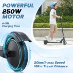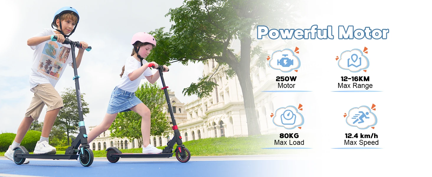 【𝐄𝐋𝐄𝐂𝐓𝐑𝐈𝐂 𝐒𝐂𝐎𝐎𝐓𝐄𝐑 𝐅𝐎𝐑 𝐊𝐈𝐃𝐒】Equipped with a 250W motor, the maximum speed can reach 12.4MPH (20km/h). Max range is 12-16 kilometers (depending on road conditions, speed and weight).
