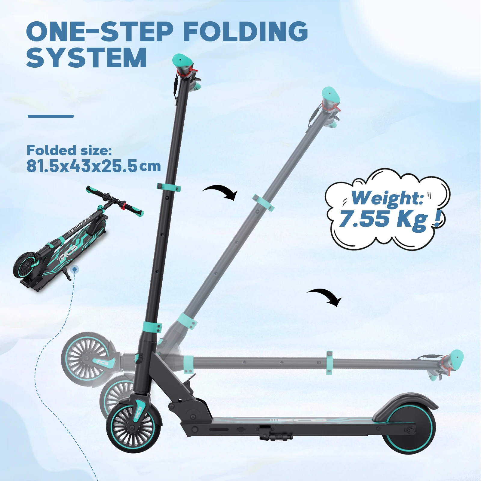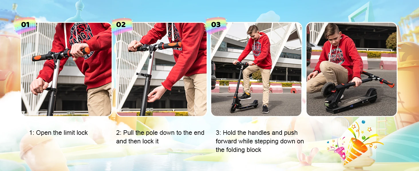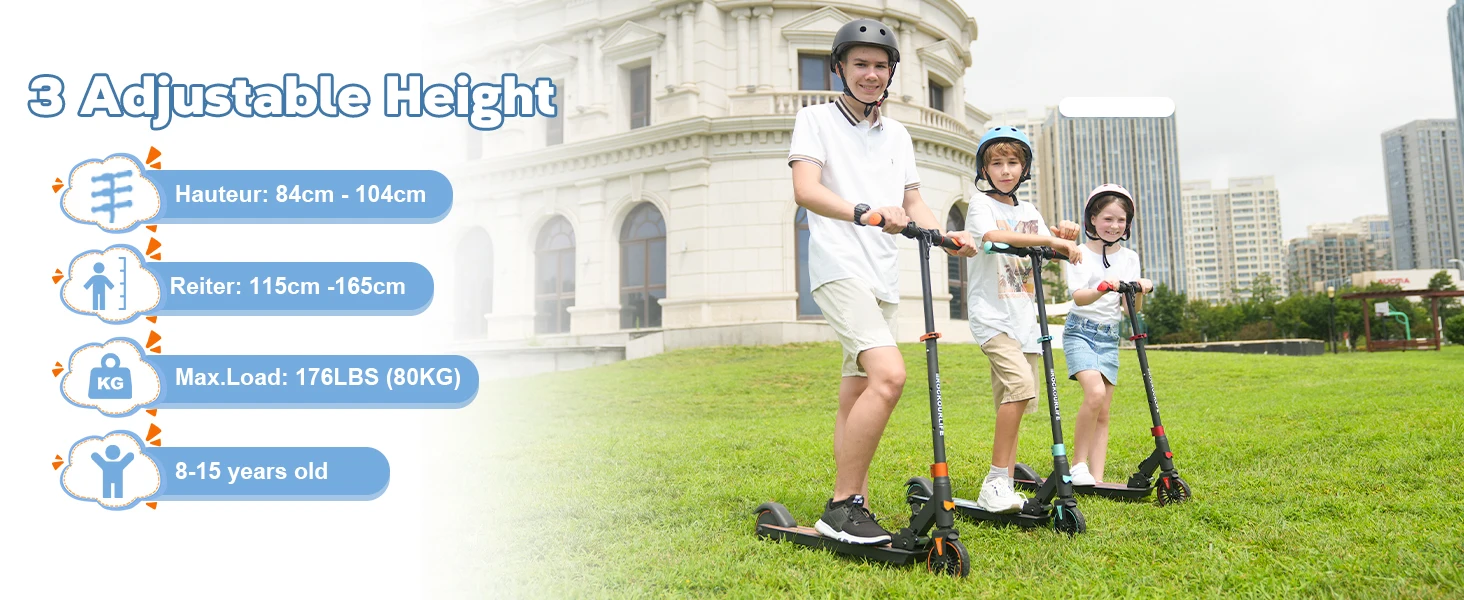 【ADJUSTABLE HANDLEBAR & PORTABLE DESIGN】Customize the e-scooter for your child’s height with an adjustable handlebar from 84-104cm, ideal for kids 1.15-1.65m tall. The foldable design, with a maximum load capacity of 80kg, ensures easy portability and storage.