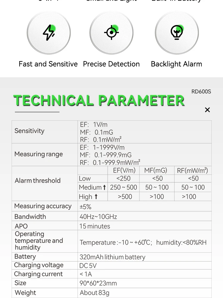 One machine Triple use, simultaneous detection of electric field,magnetic field and Redio radiation; sound and light alarm, automatic alarm beyond safety value, one-button operation, LCD graphic display radiation value trend, radiation evaluation, intimate reminder whether current radiation value is safe; Cute appearance, easy to operate with one hand, easy to move or measure on site.