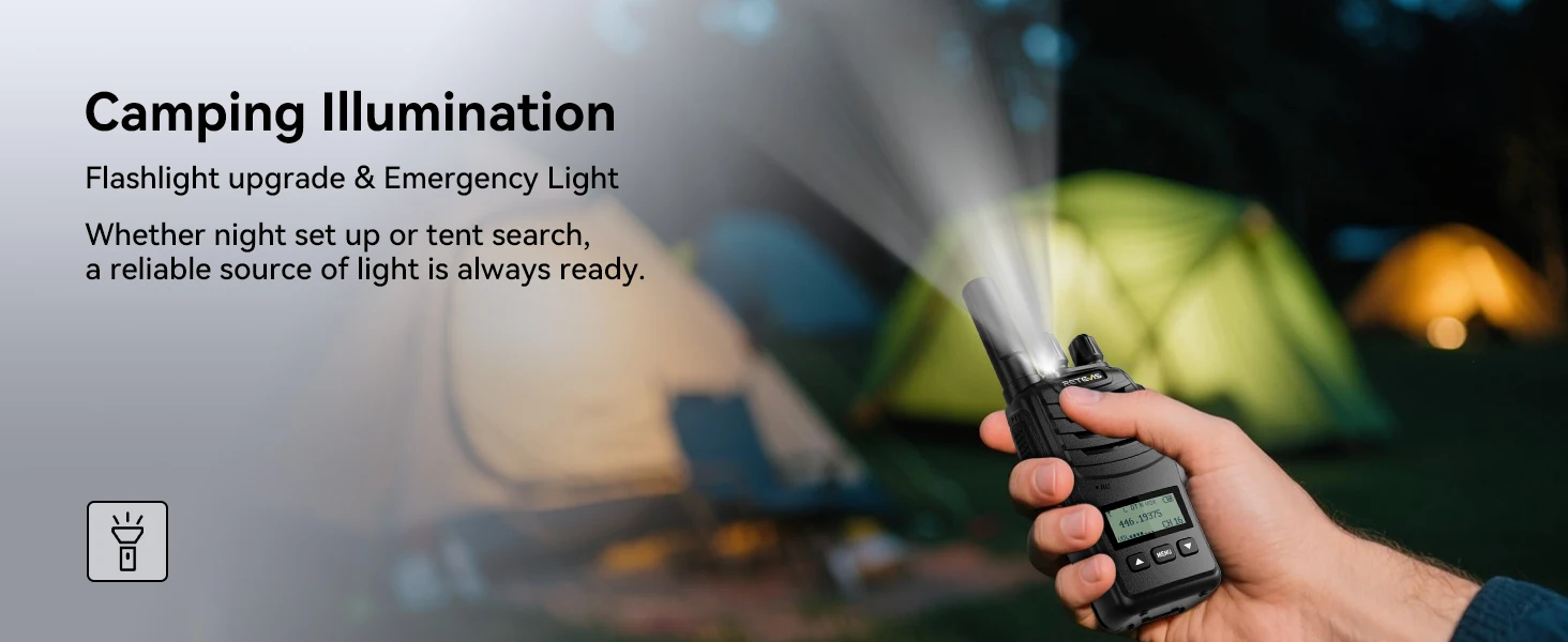 the handheld walkie talkies’ flashlight now includes an emergency light mode; activated by a short press twice of Side Key 2; easy switch between regular and emergency lighting; for navigating in the dark during camping trips.