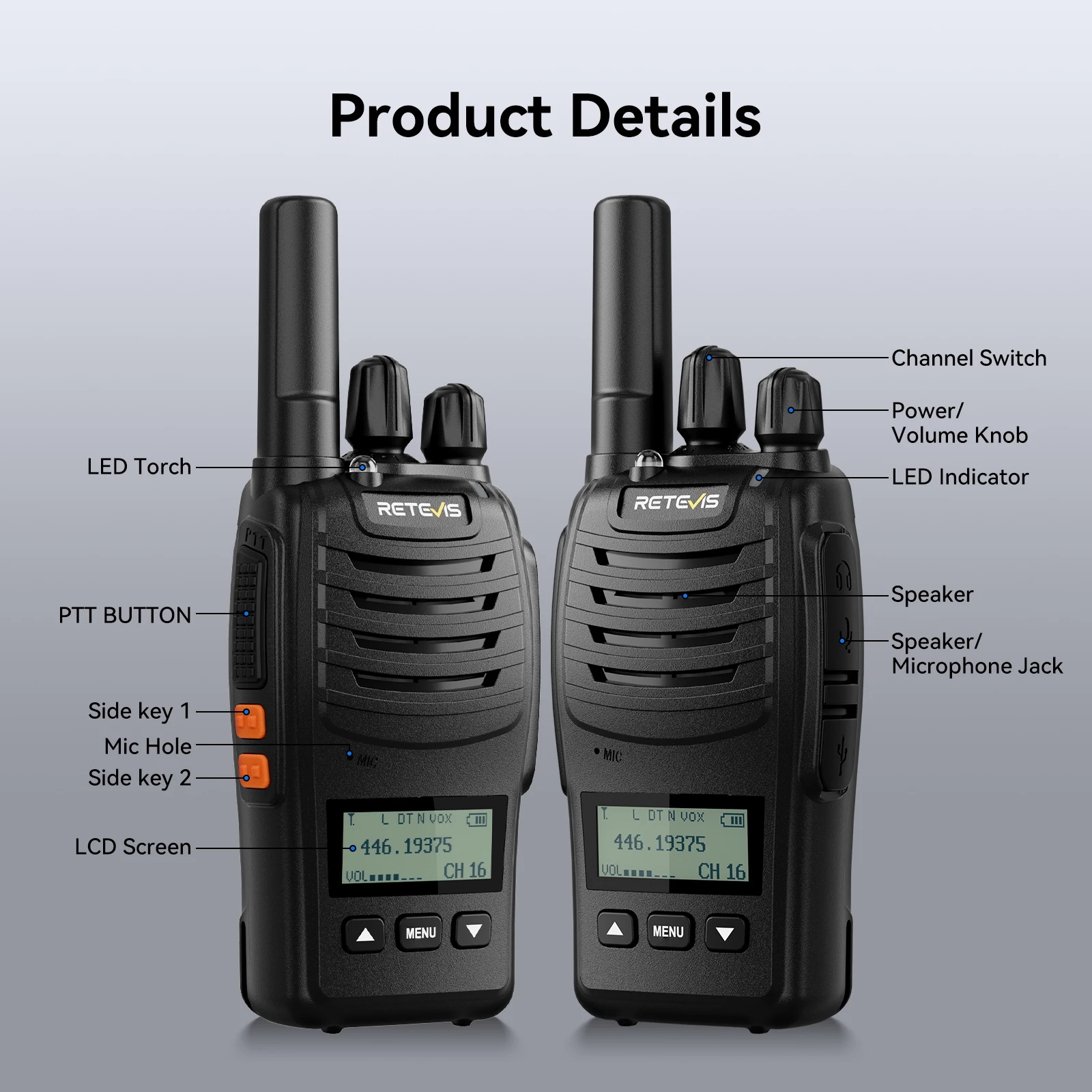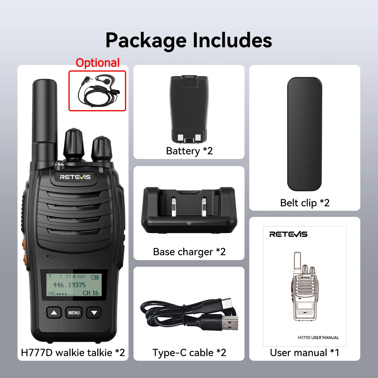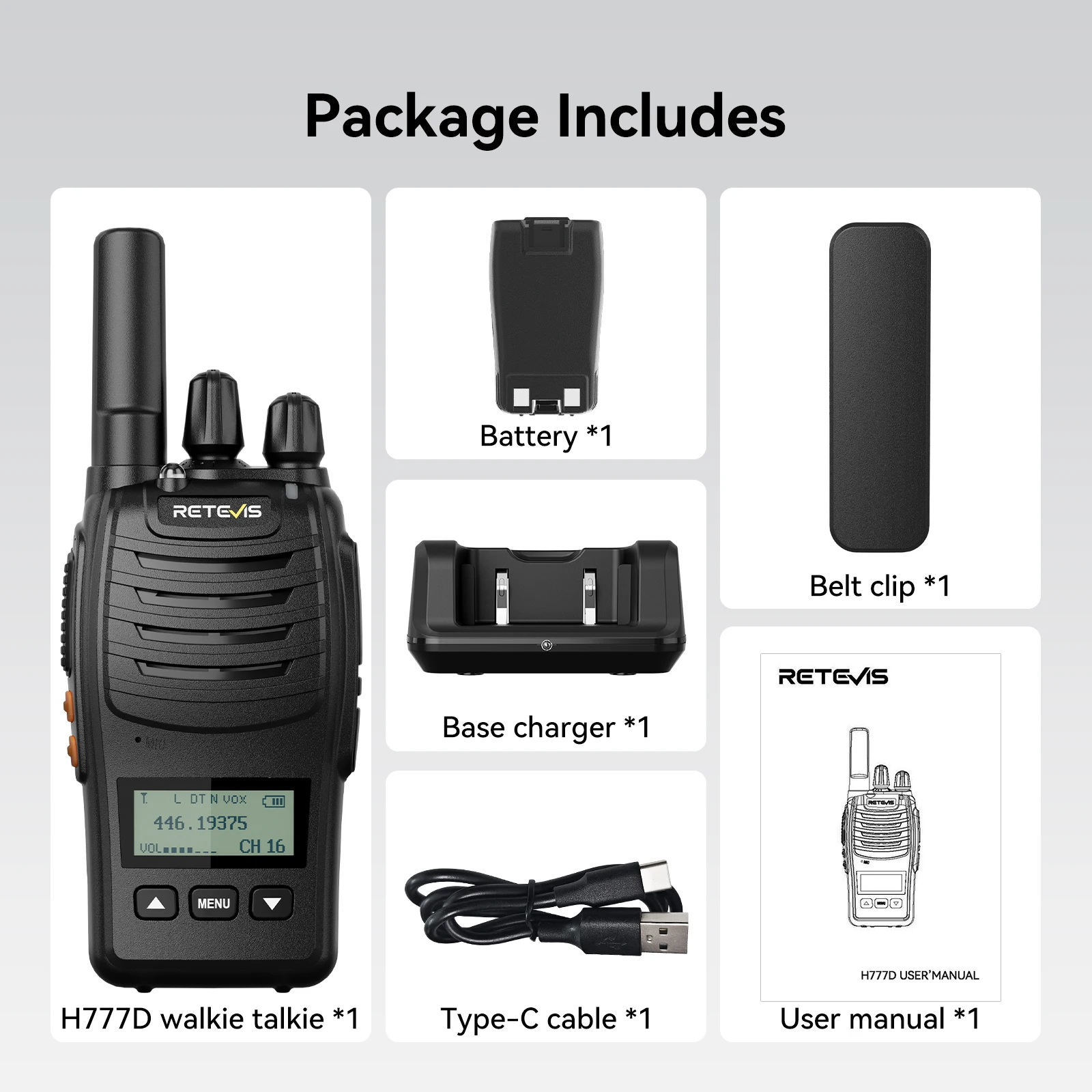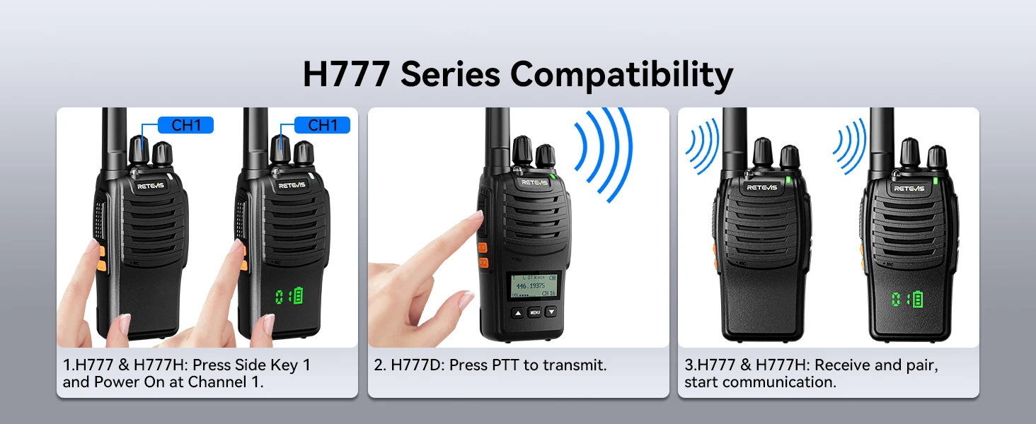 Retevis H777D portable walkie talkie is upgraded with a Type-C charging port and Type-C charger, LCD Display,also added with one-key pairing function. It has a long battery life-up to 12 hours-and comes with a belt clip for hands-free use. The radio is small and lightweight, making it easy to carry around with you. H777D portable hands-free 2 way radios can be widely used for School, Camping, security, storage, catering,and other outdoor activities.