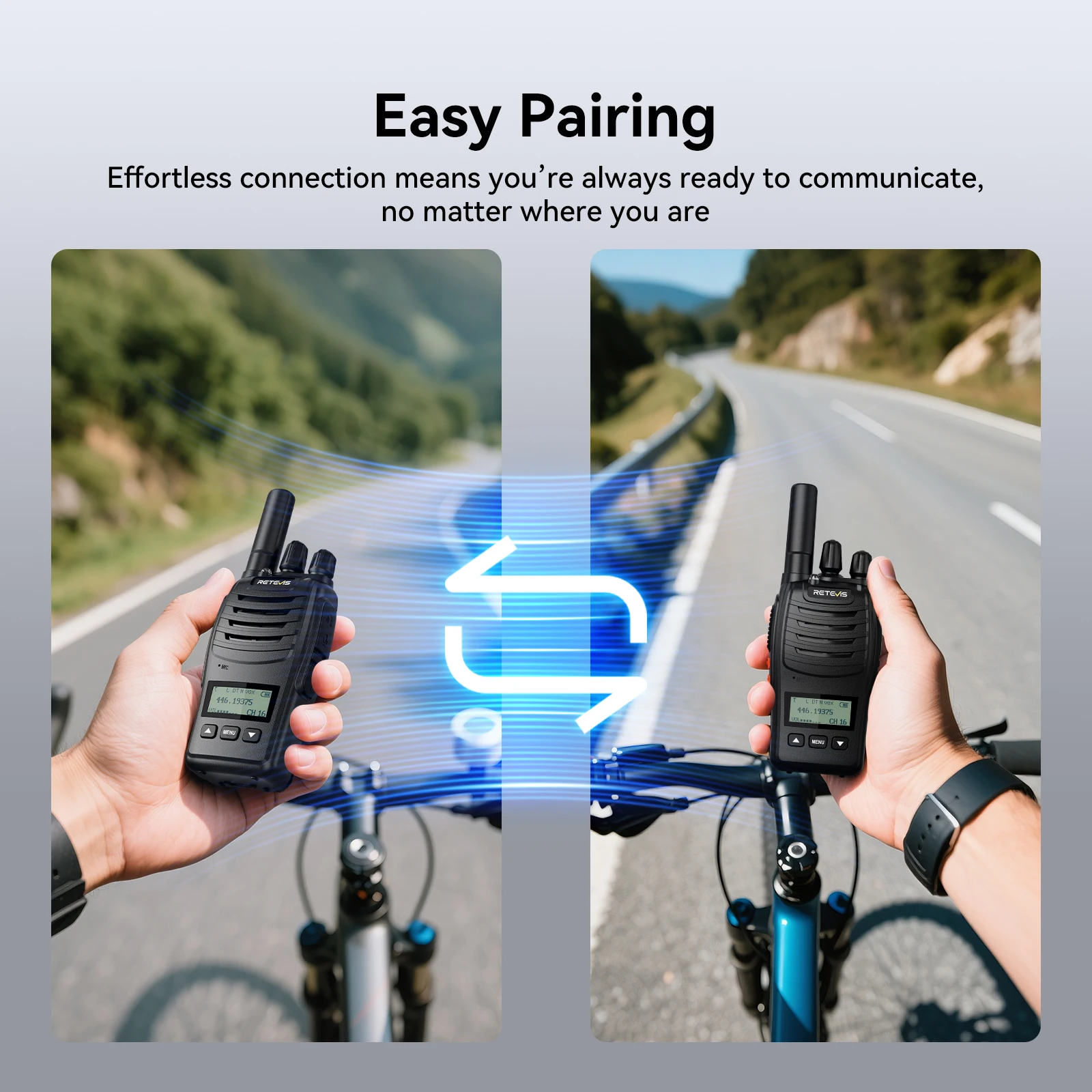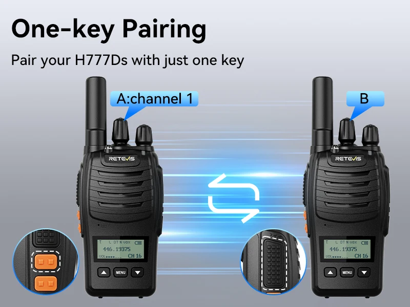 simply tune walkie talkie to channel 1; hold down the Up button while powering on; and enter the pairing mode; for families quickly setting up communication; campers synchronizing devices; or cyclists linking up for group rides