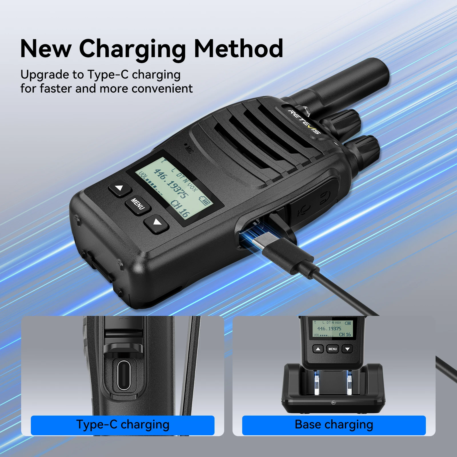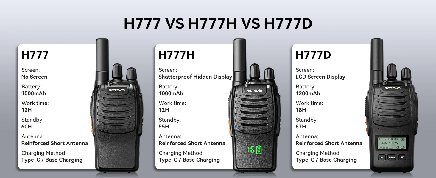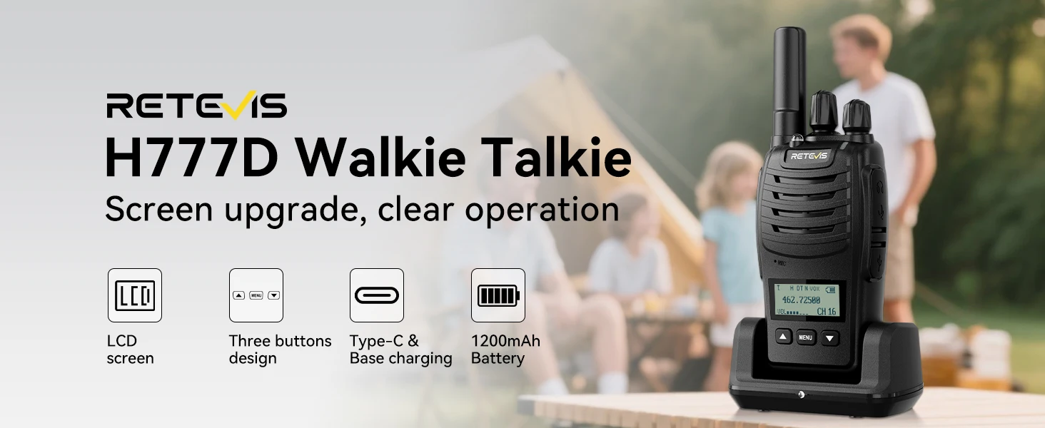 the H777D walkie talkies rechargeable supports both Type-C and base charging; ensuring you’re never left without power; for families on the go; campers in remote locations; or cyclists needing a quick recharge