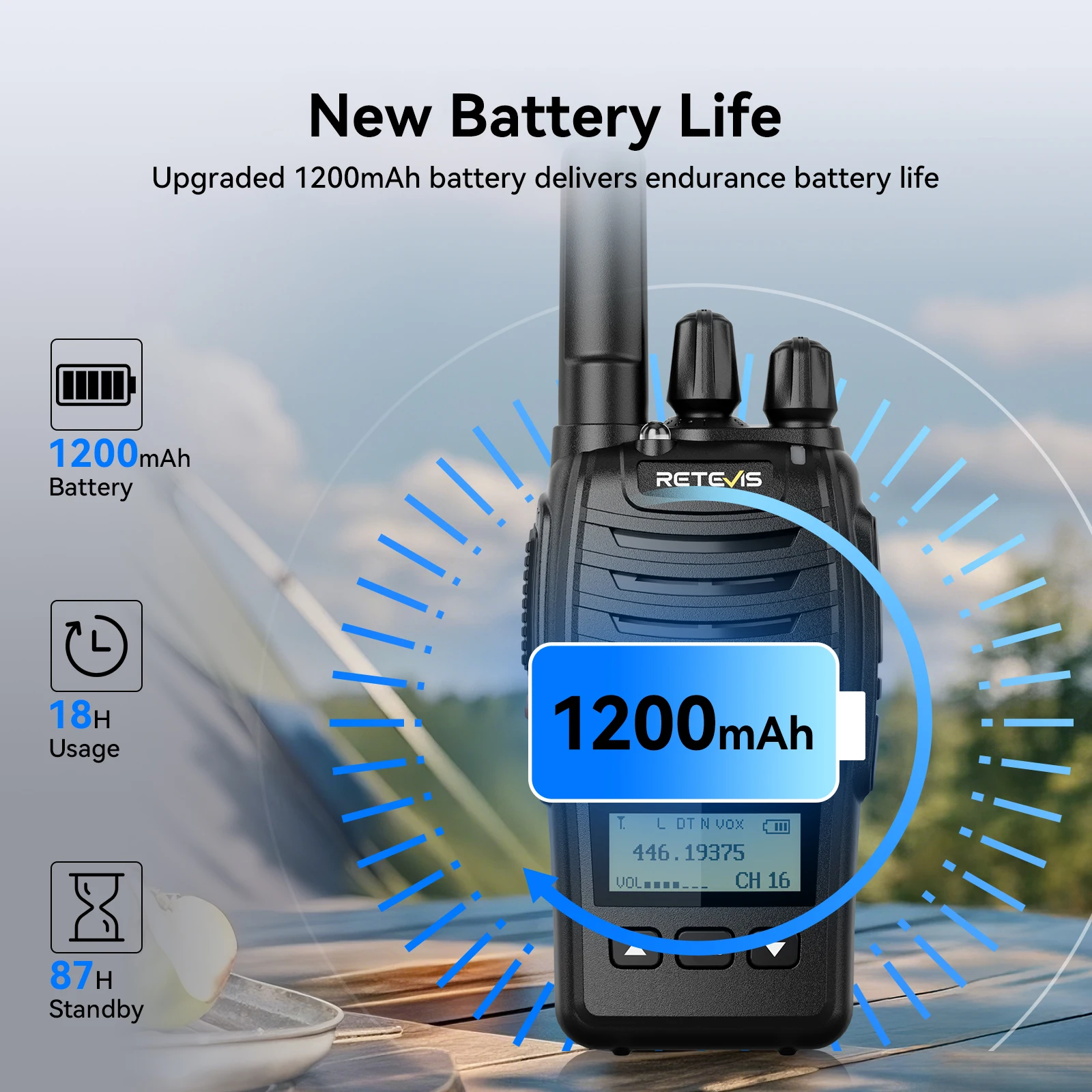 enjoy longer communication with the walkie talkies’ upgraded 1200mAh battery; offering over 19 hours of continuous use and over 30 hours of standby time; for family reunions; extended camping trips; or all-day cycling adventures