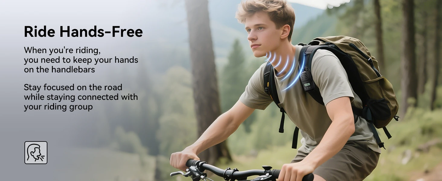 activate VOX mode by long-pressing Side Key 2; with the screen interface of portable walkie talkies showing its status; for family activities or cycling adventures; can provide hands-free communication