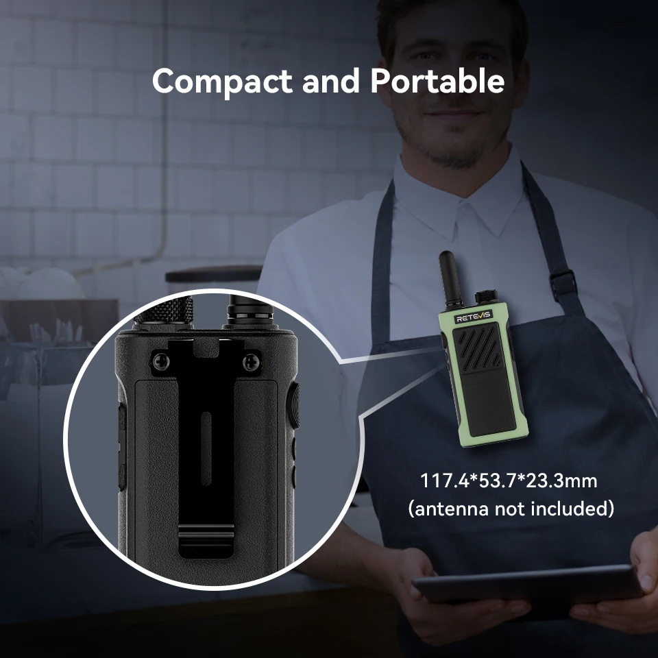 with a durable metal belt clip and 0.31Ib weight; you can easily carry the 2 way radio for efficient communication at work