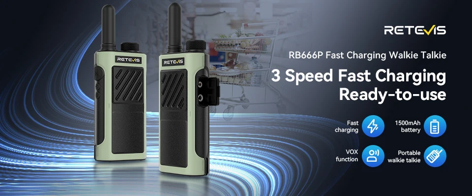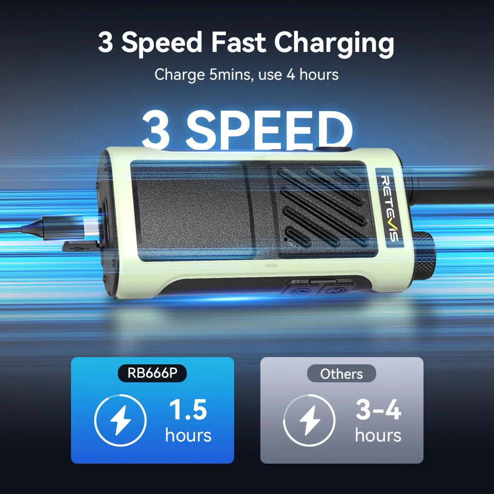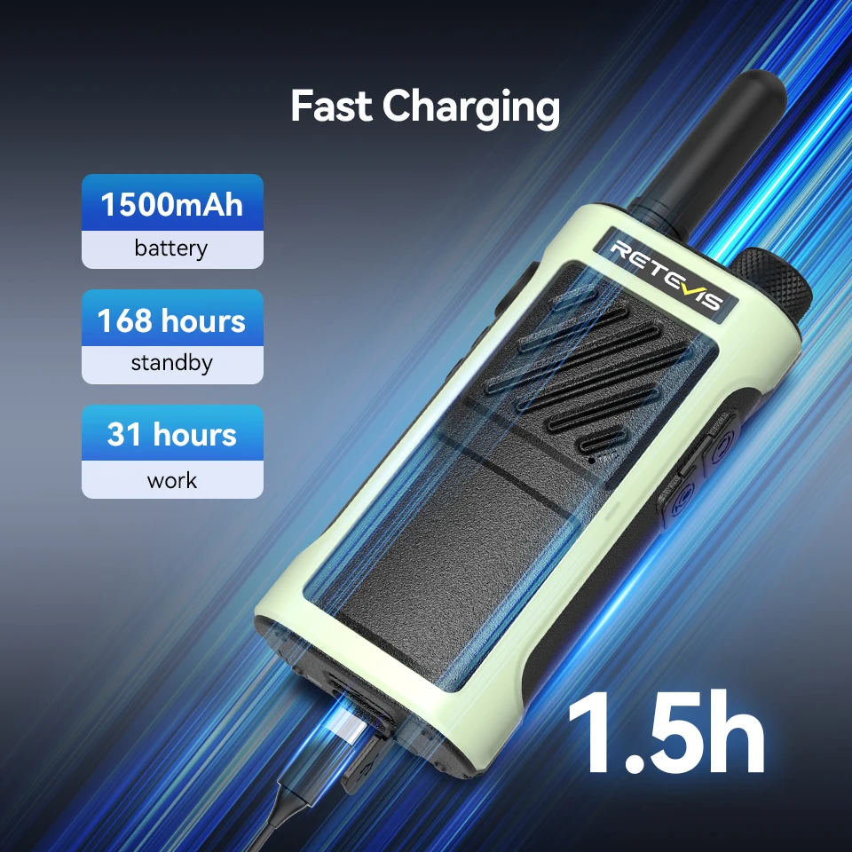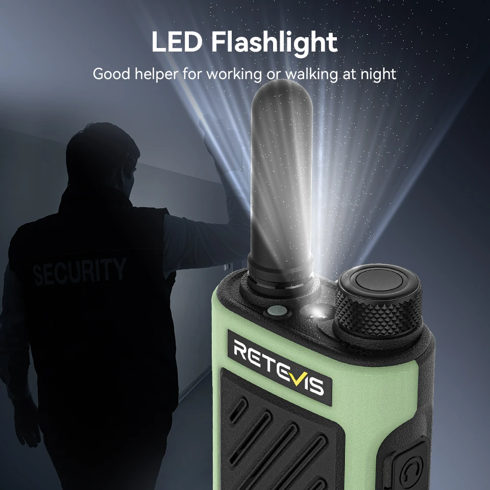 Retevis RB66P 3-speed fast charging walkie talkie is ready to use 1.5 hours’ charging time, 1500mAh battery, 23 hours’ continuous work time, and 168 hours’ long standby time effectively meet standard shift needs. LED flashlight and fluorescent design increase the night use convenience. No matter personal or work use, RB66P is a better choice.