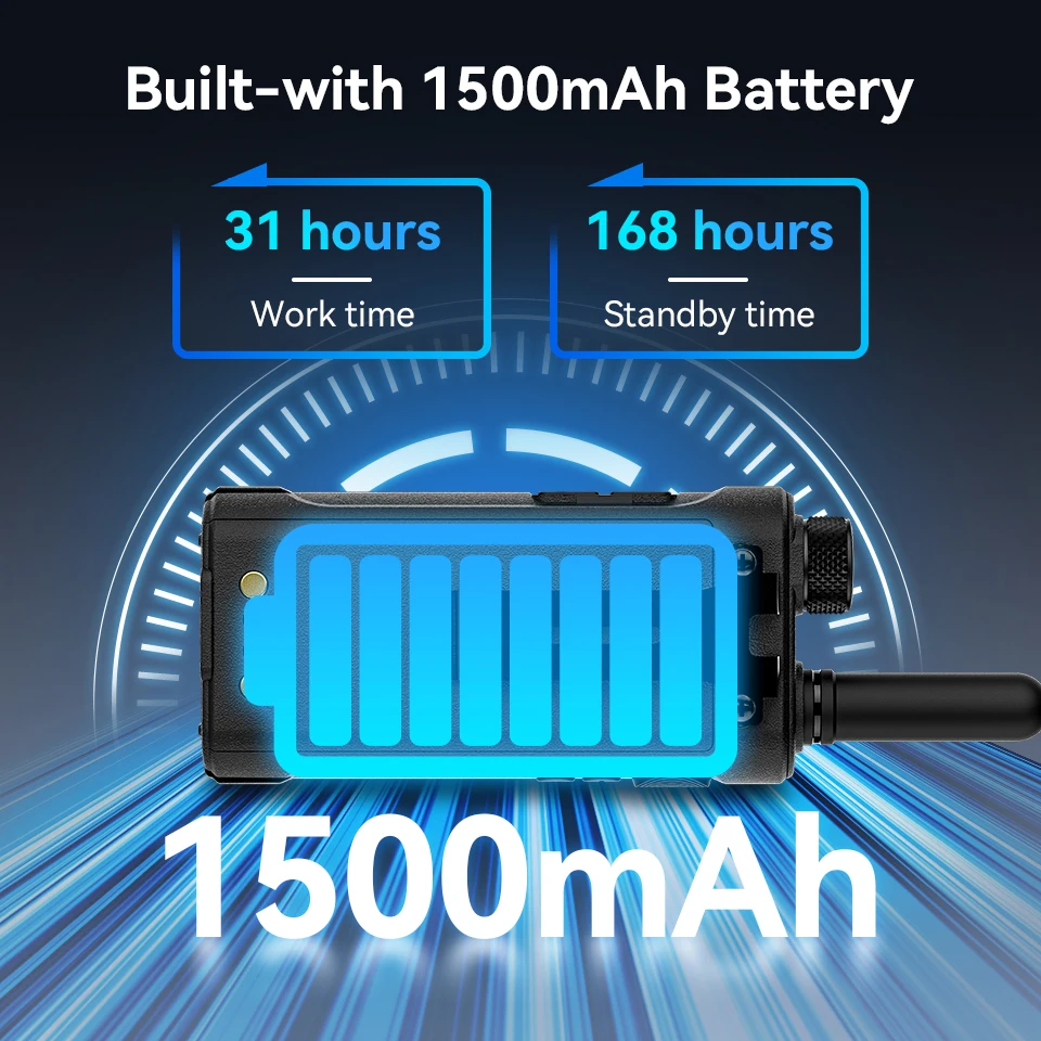 walkie talkie has a built-with 1500mAh li-ion battery; which provides up to 23 hours’ work time; you can use RB66P for a whole day without worries; regardless of outdoor activities or work use