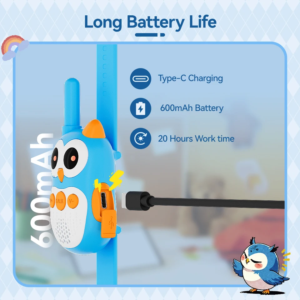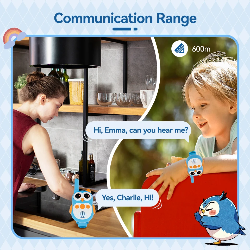 With simple push-button controls and an owl-themed exterior; walkie-talkies light up when powered on or in use; captivating kids with glowing owl eyes.