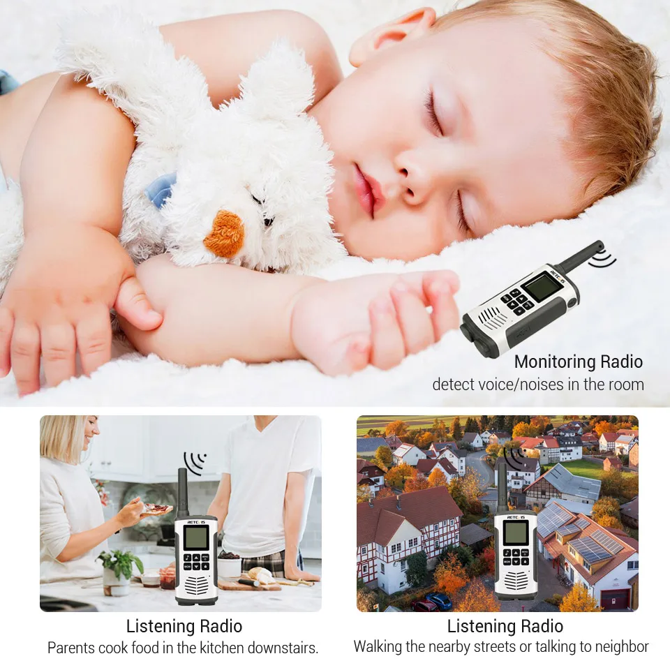 Turn on the room monitor and put the listening radio next to the sleeping child. Then you take monitoring radio radio to work in the yard or talk to your neighbor. When your child makes a sound, you can receive it at the first time.