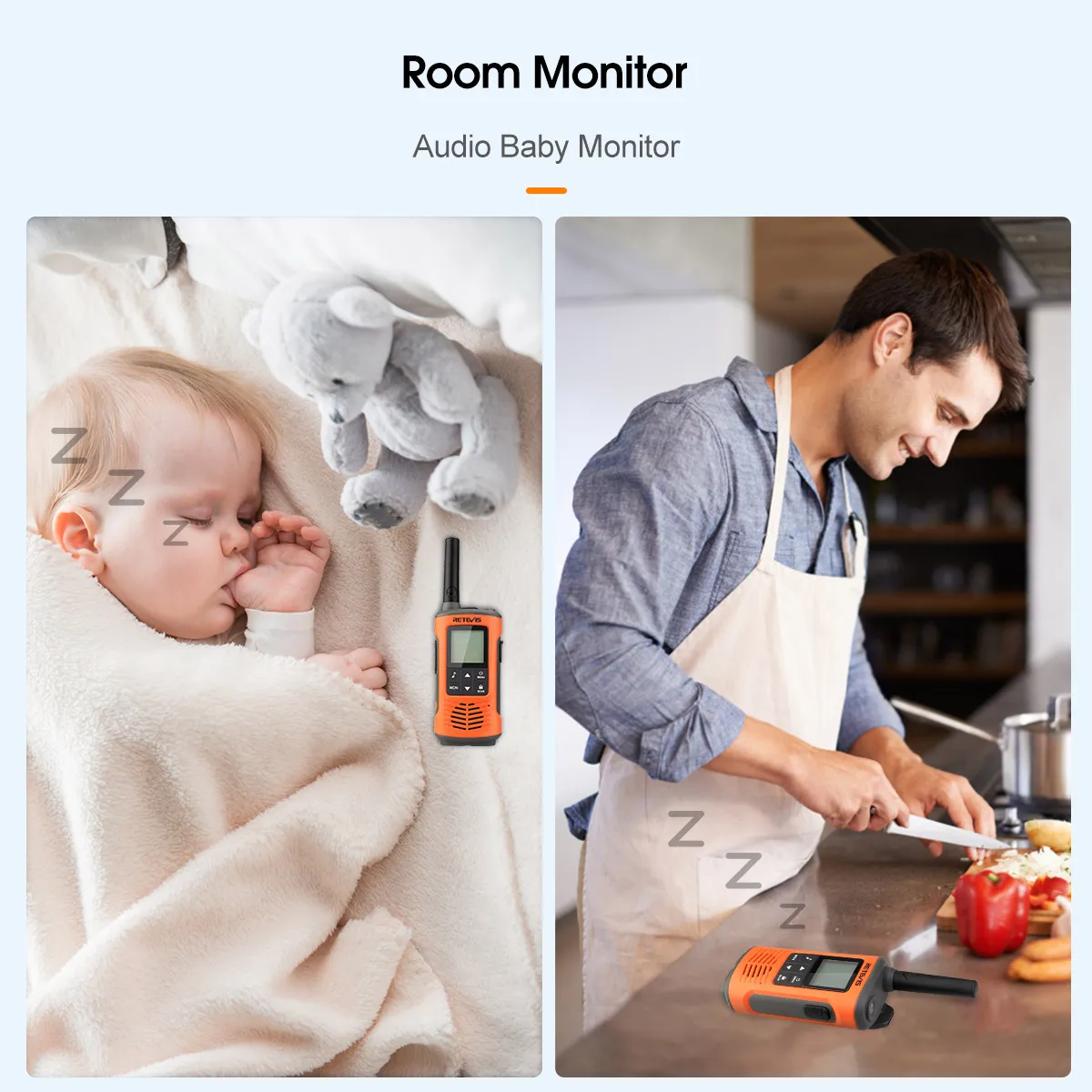 Turn on the room monitor function as an audio baby monitor. Put one RT45P in baby room, and the other one on your side. If your baby wakes up or cries, you will listen to the sounds and then comfort your baby.