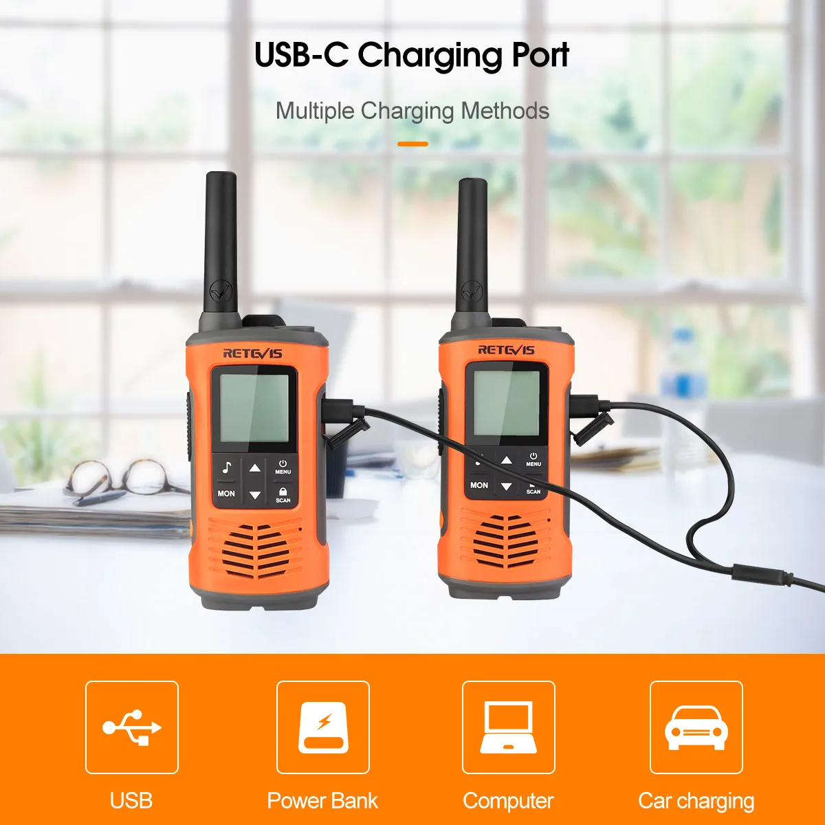 USB charging provides you with more charging options, such as charging through a car charger, a power bank or a computer. Design of dual port type C splitter charging cable allows you to charge two walkie talkies at the same time, which is more convenient and quick.