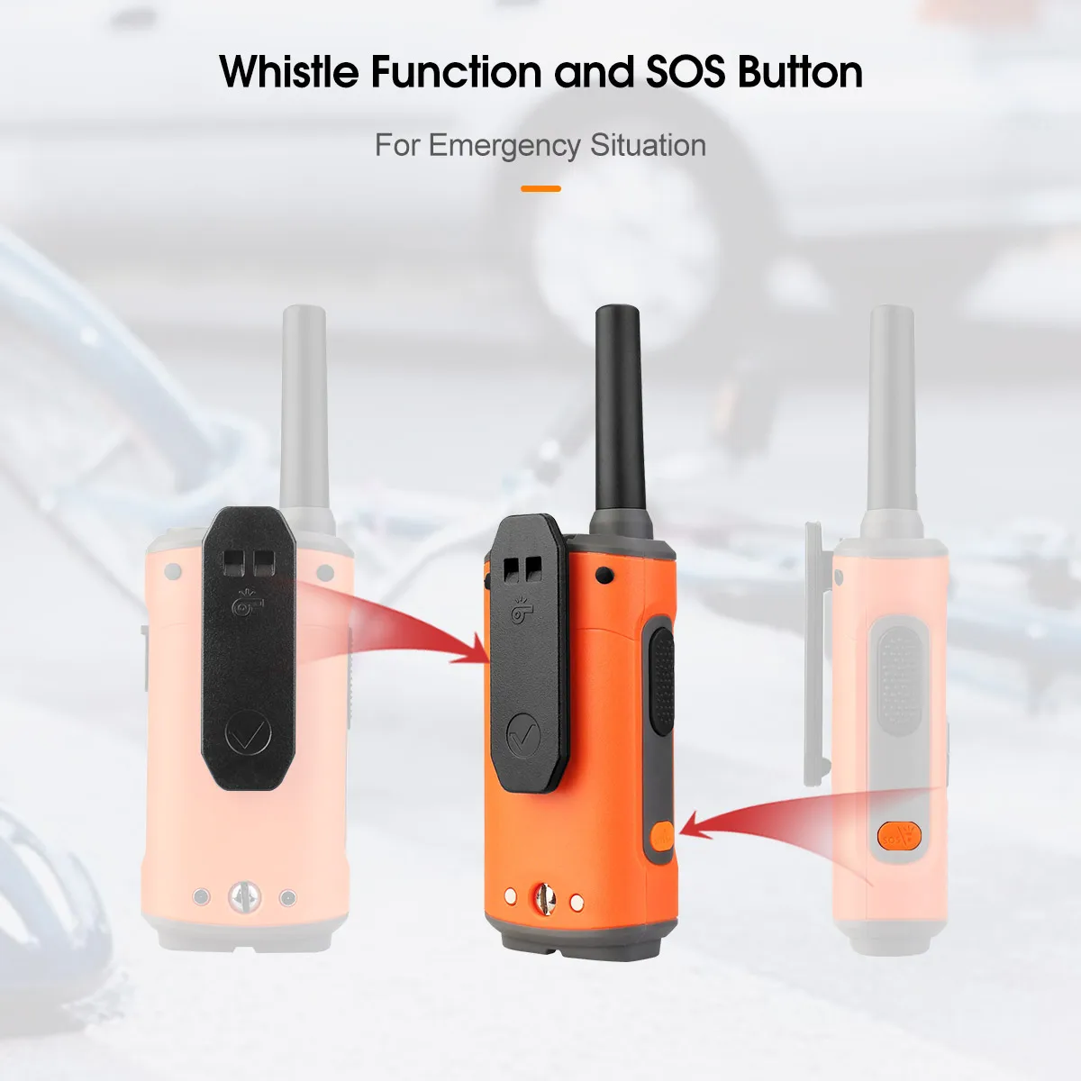 Comes with whistle design and SOS button, when you are in dangerous situations, you can press the orange button to send signal and remove the belt clip as a whistle to make a loud sound for help.