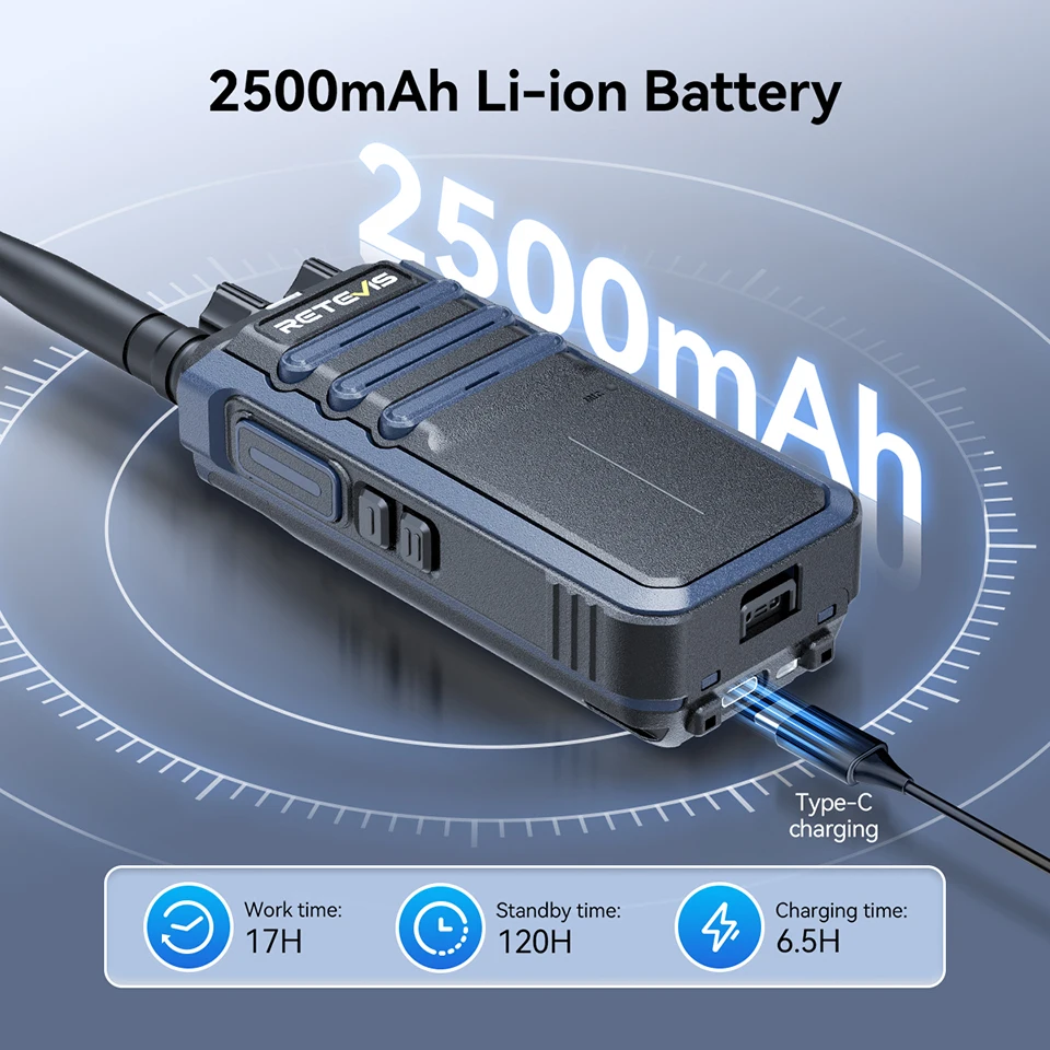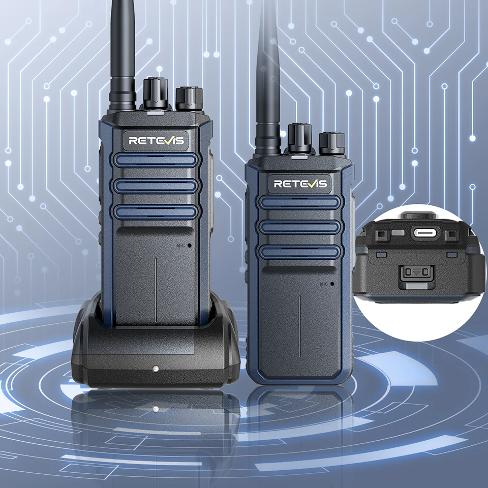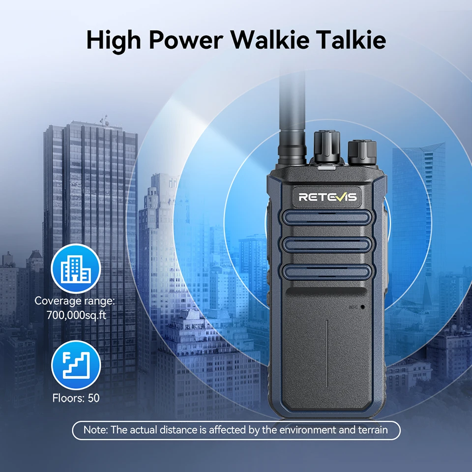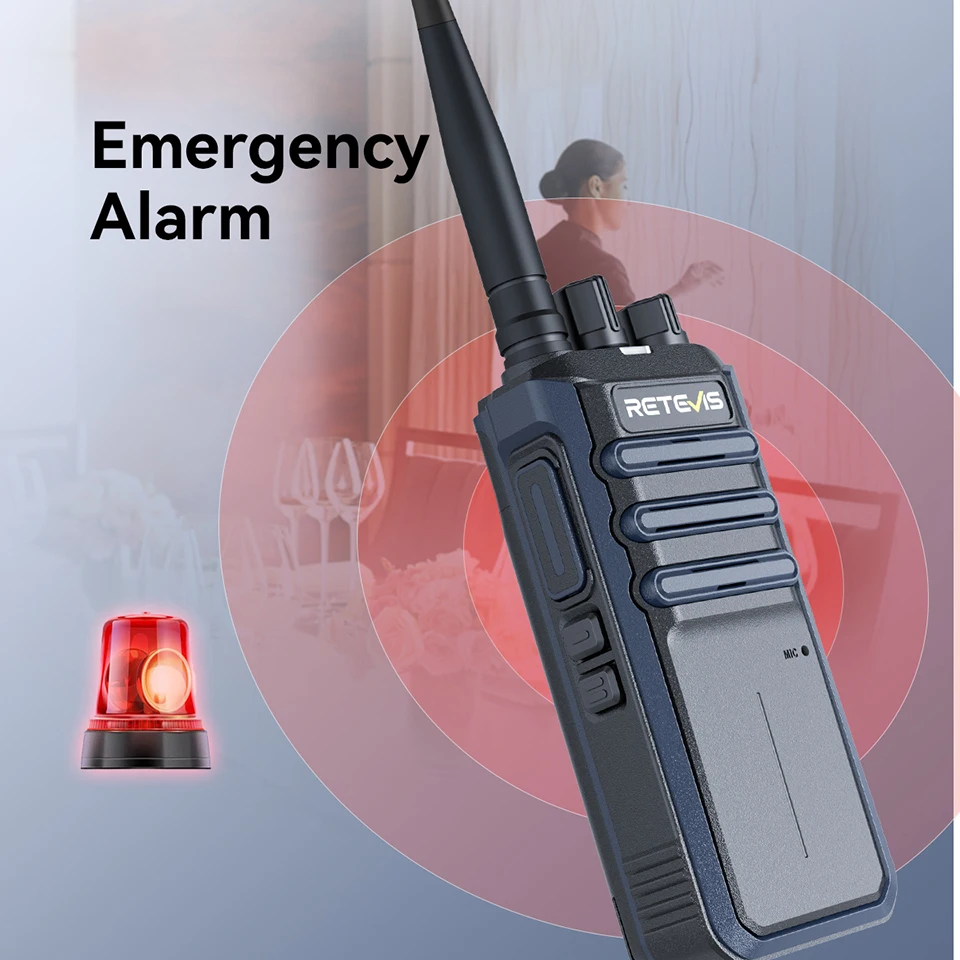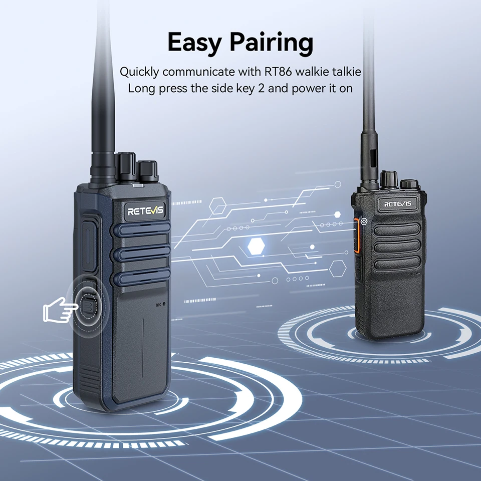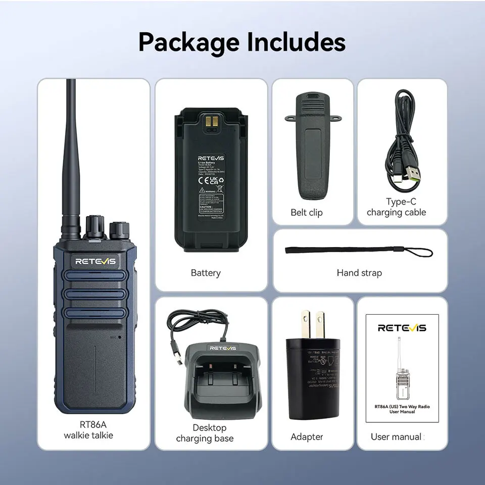 Retevis RT86A walkie talkie is efficient in extending communication range for meeting various occasions use. High power offers a stable signal to communicate within 700,000sq.ft/60000sq.m coverage range and 50 floors. Group call and easy pairing enable you to operate two way radio easily and fast. 2500mAh battery and type-C charging effectively ensure the durability of operation. ABS material keeps the solidness of RT86A. Emergency alarm and VOX function increase convenience and security at work. Whether for road trips or work use, RT86A 2 way radio will be your good partner.