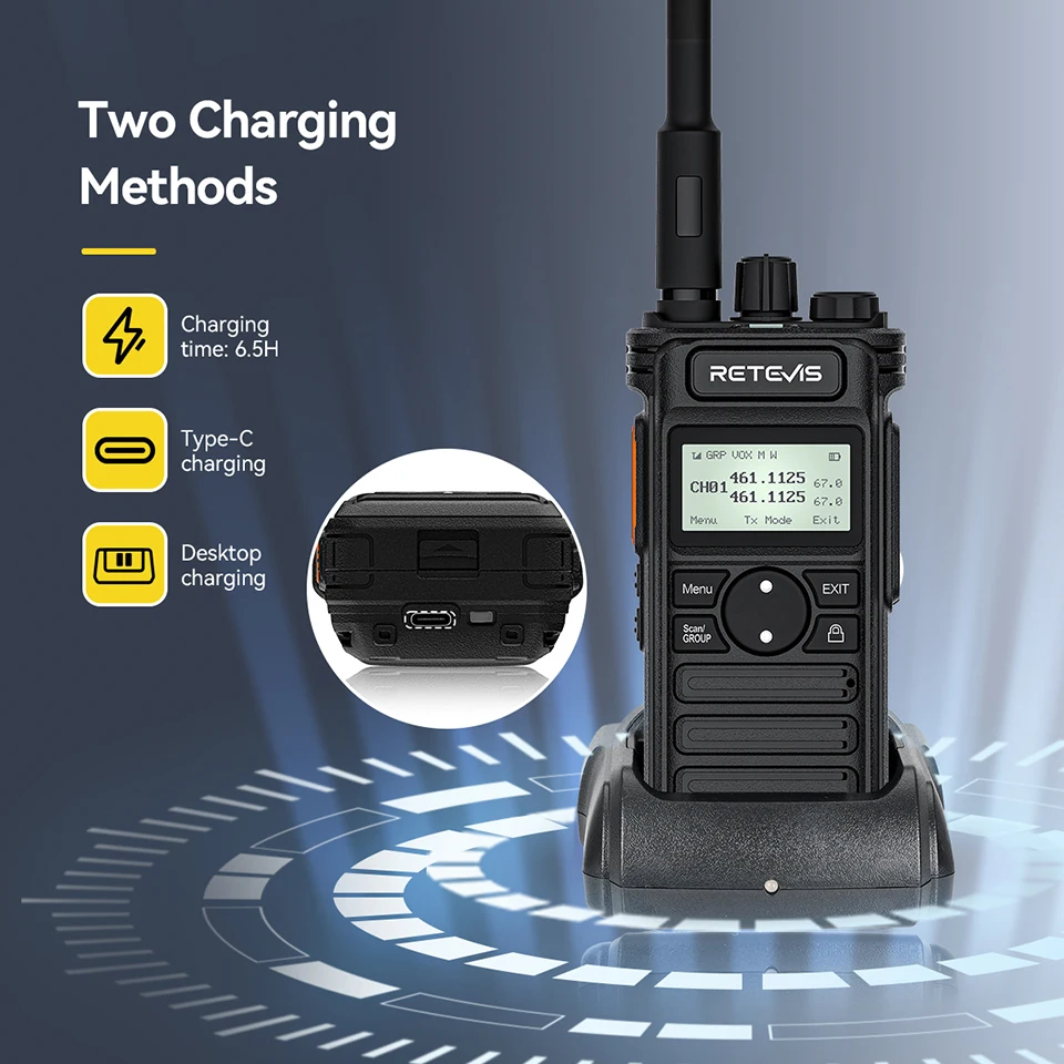 RT86S communication radio supports both Type-C and desktop charging, allowing flexible power options. Charge effortlessly via a power bank, PC, vehicle, or adapter, ensuring uninterrupted operation. With a 6.5-hour charging time, you can stay powered up and ready for work anytime, anywhere.