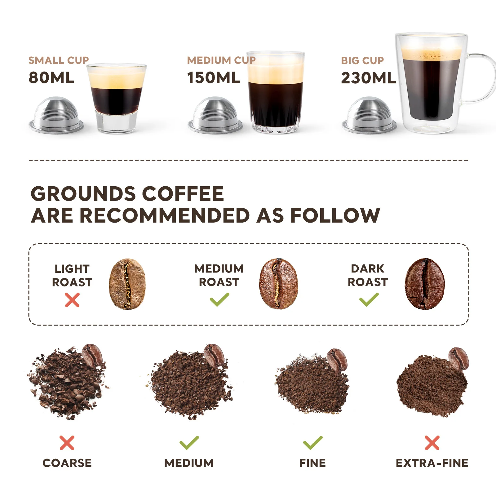 [SIZE]: There is no difference in the size of the 70/150/230ml capsules except for the capacity of the coffee that comes out.
