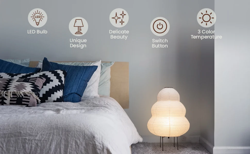 The rice paper floor lamp has three light colors that can be adjusted. It is equipped with advanced LED bulbs. Compared with standard halogen floor lamps or other traditional incandescent lamps, it has a longer life and helps to save power