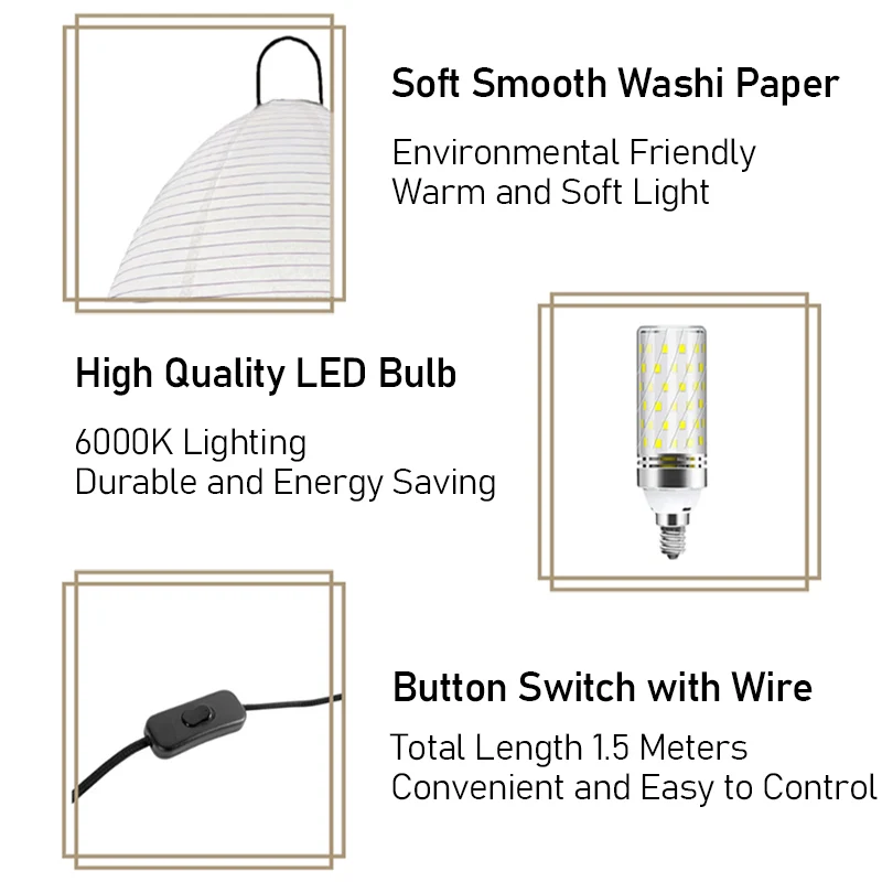 Each paper lantern is handmade by a professional craftsman. Rice paper lampshade makes it emit soft and uniform light. We select high-quality rice paper, through moisture-proof and mildew proof technology, and match with iron lamp holder to complete this beautiful lamp.