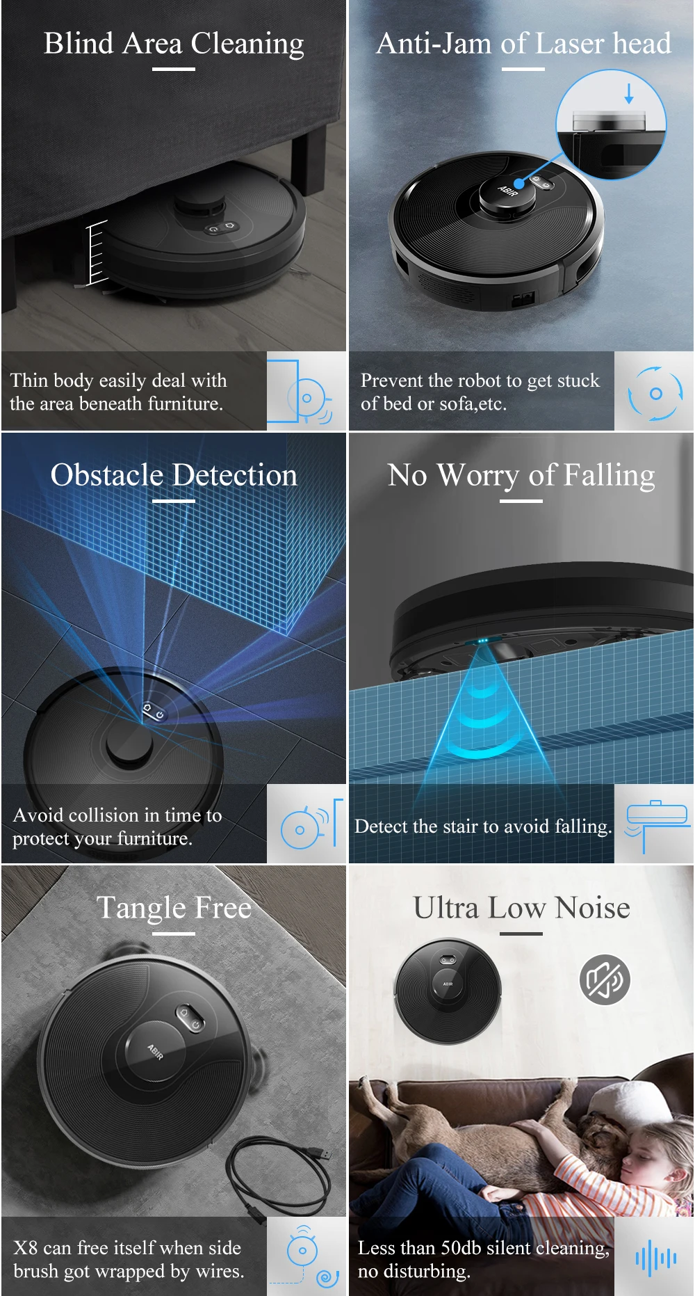 4.Updated fan motor make real 6500PA Suction with low noise . Using 7-fold noise reduction combination strategy, ABIR X8 is much quiet than other brands when in max mode.