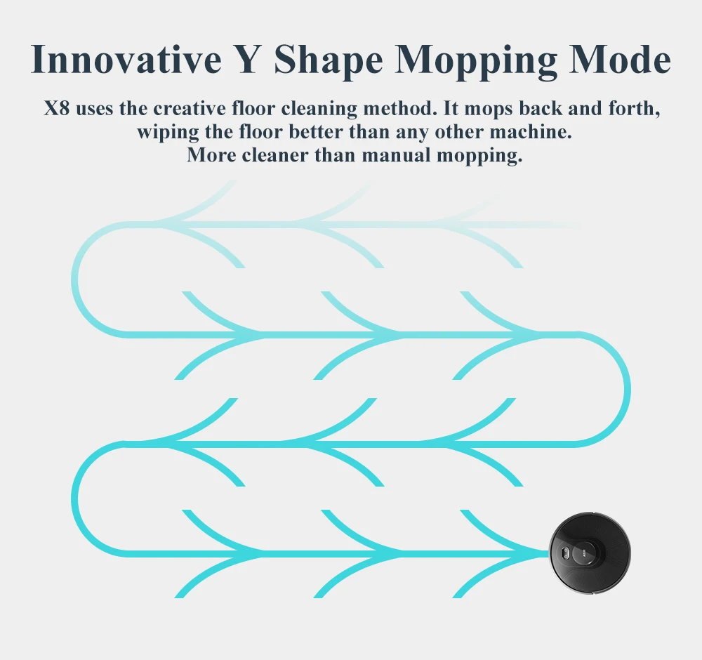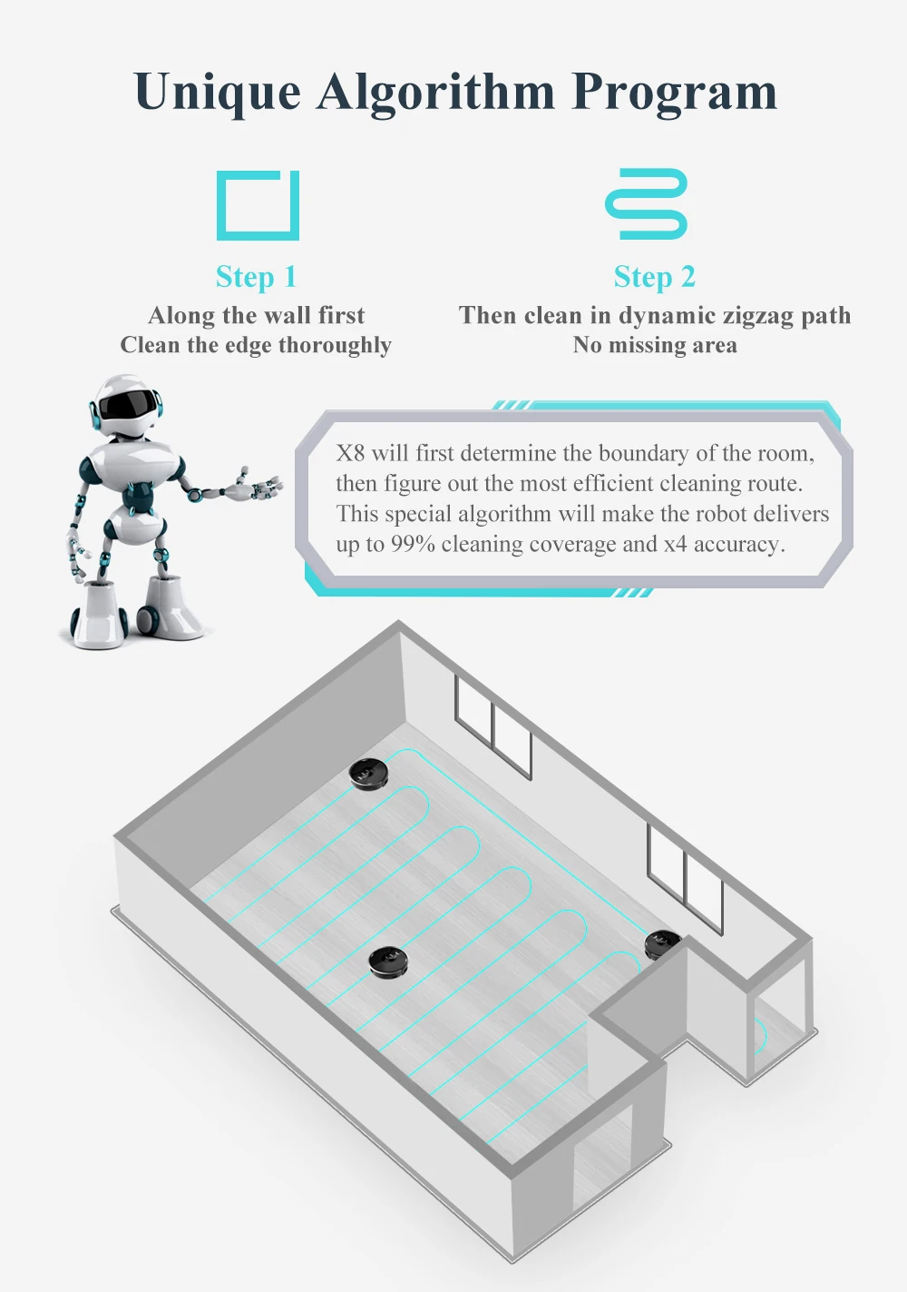 2. Unique Algorithm Program for X8, First determine the boundary of the room, then figure out the most efficient cleaning route.Other brand only work in AI Normal Path. Low coverage than X8.