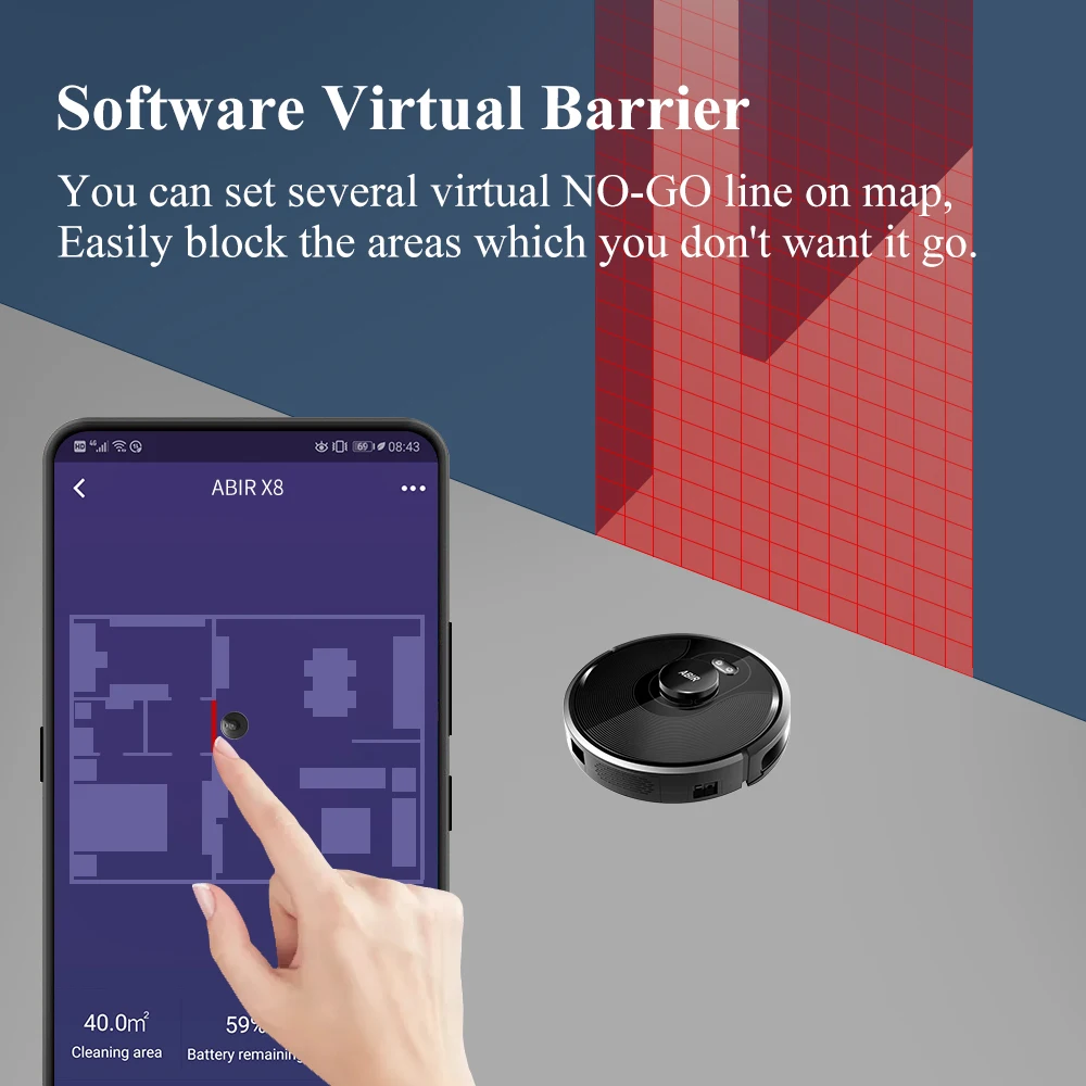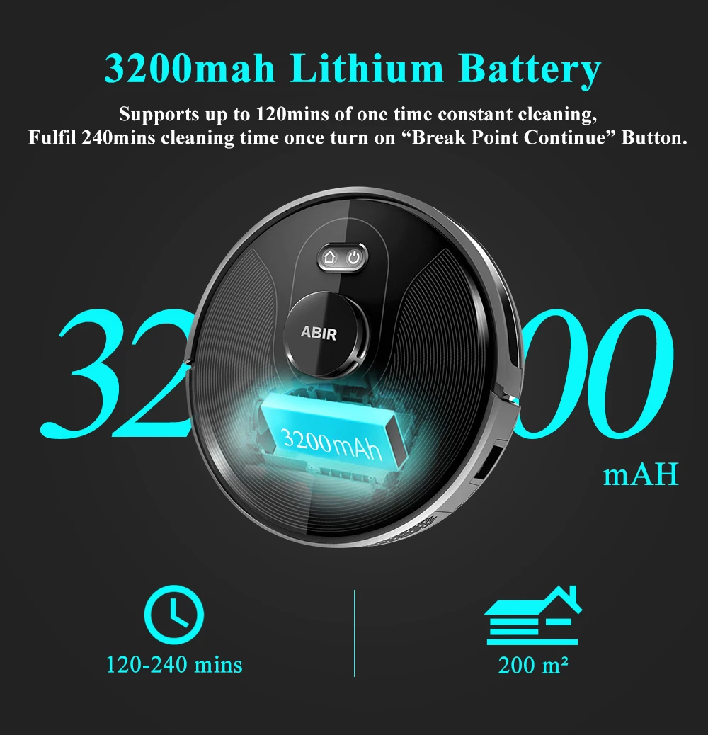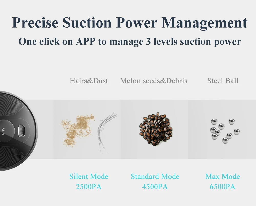 4.Updated fan motor make real 6500PA Suction with low noise . Using 7-fold noise reduction combination strategy, ABIR X8 is much quiet than other brands when in max mode.