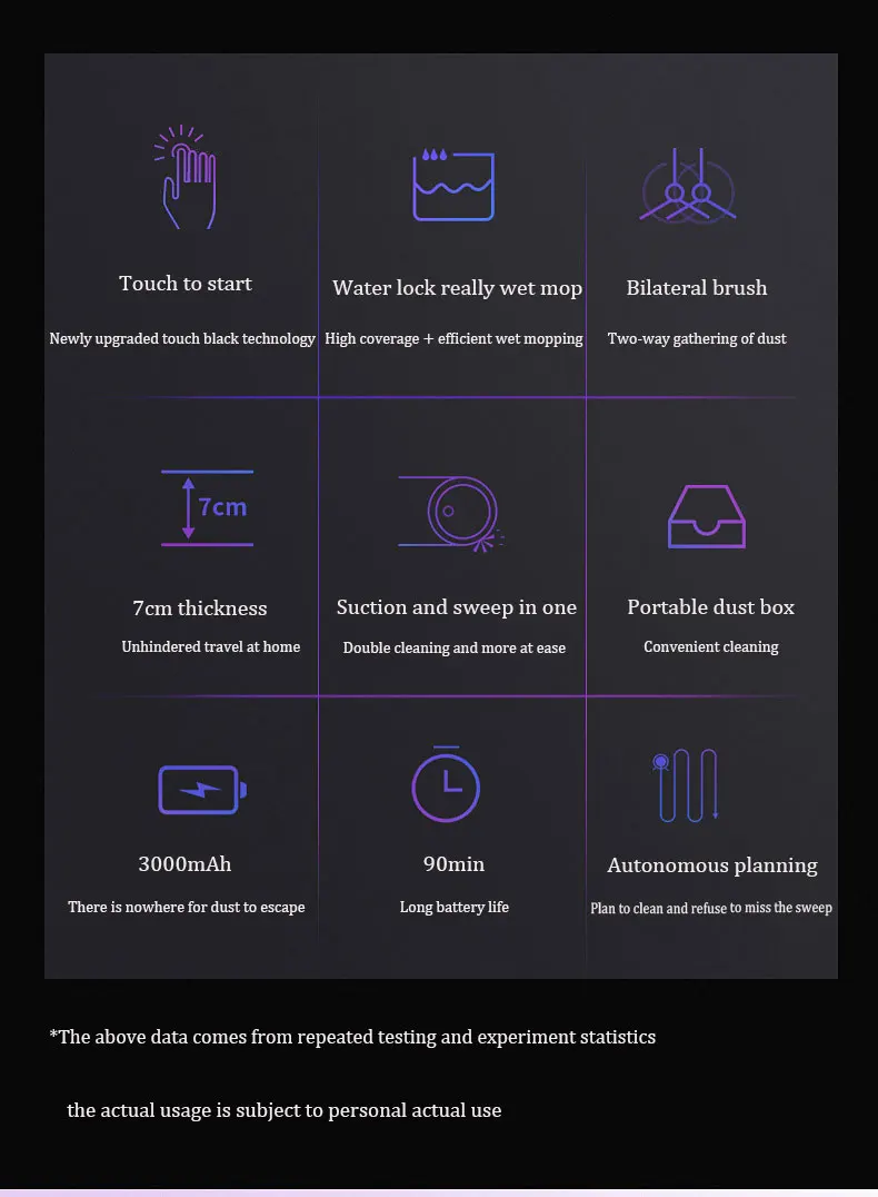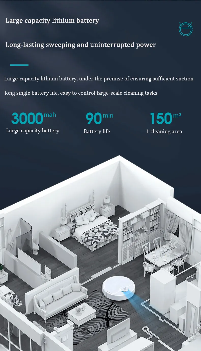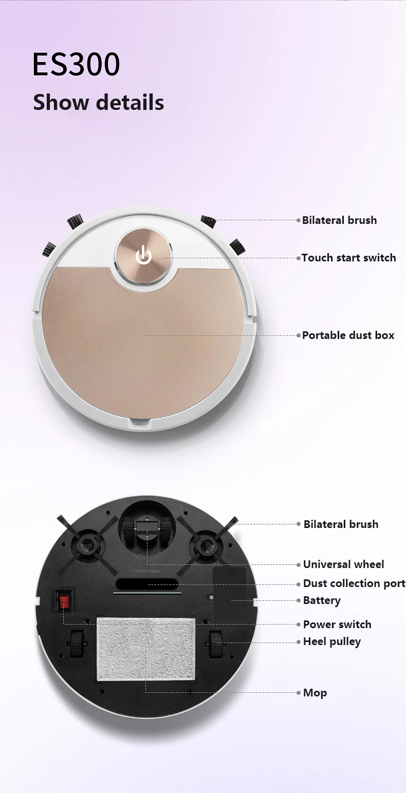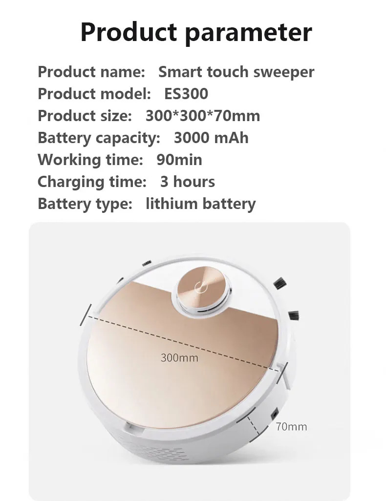 One-button start, adsorption of dust and hair, cigarette butts, melon seed shell, automatic change of direction, etc., built-in 3000 mAh lithium battery.