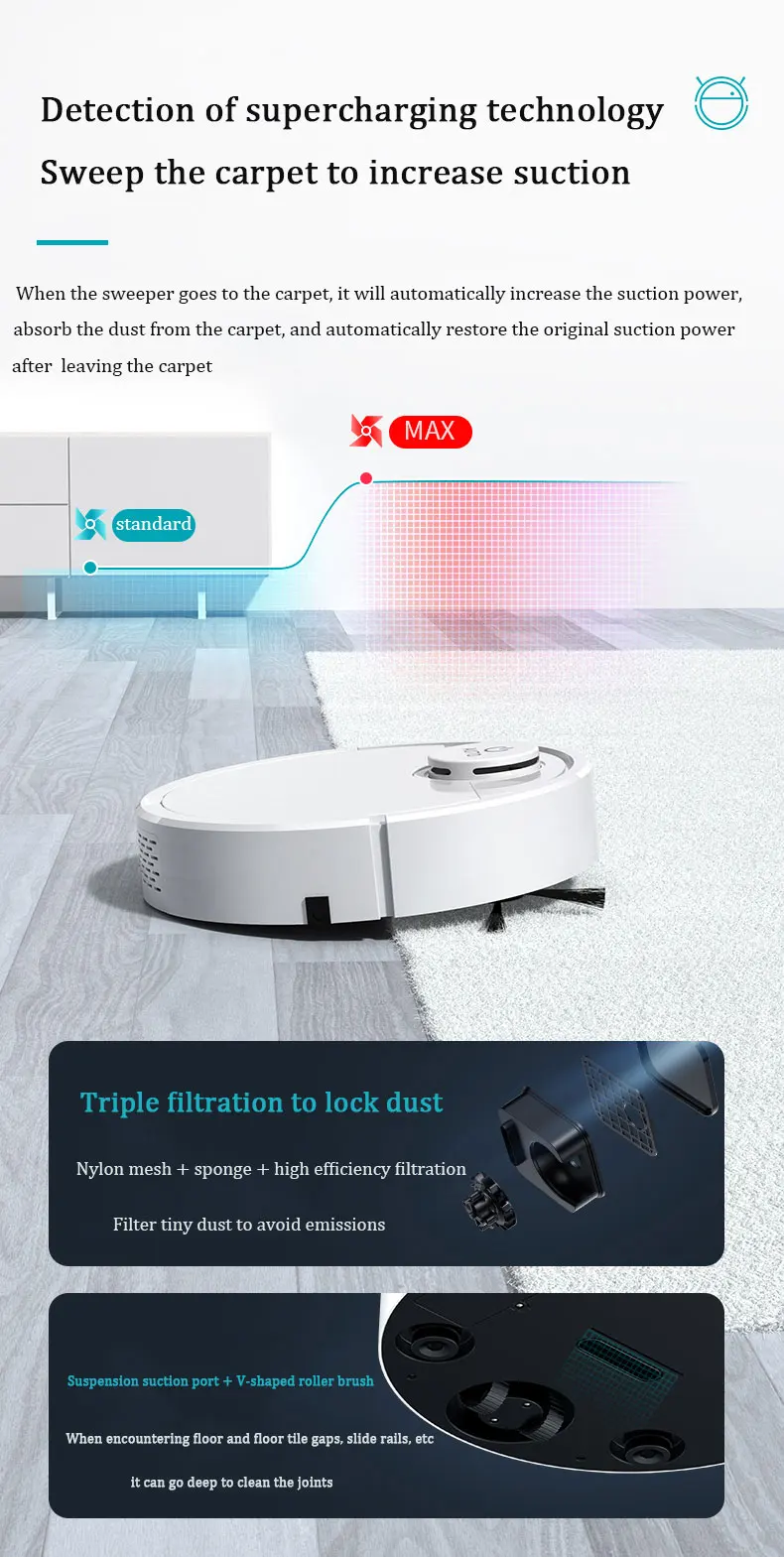 When the sweeper goes to the carpet, it will automatically increase the suction power, absorb the dust from the carpet, and automatically restore the original suction power after leaving the carpet.