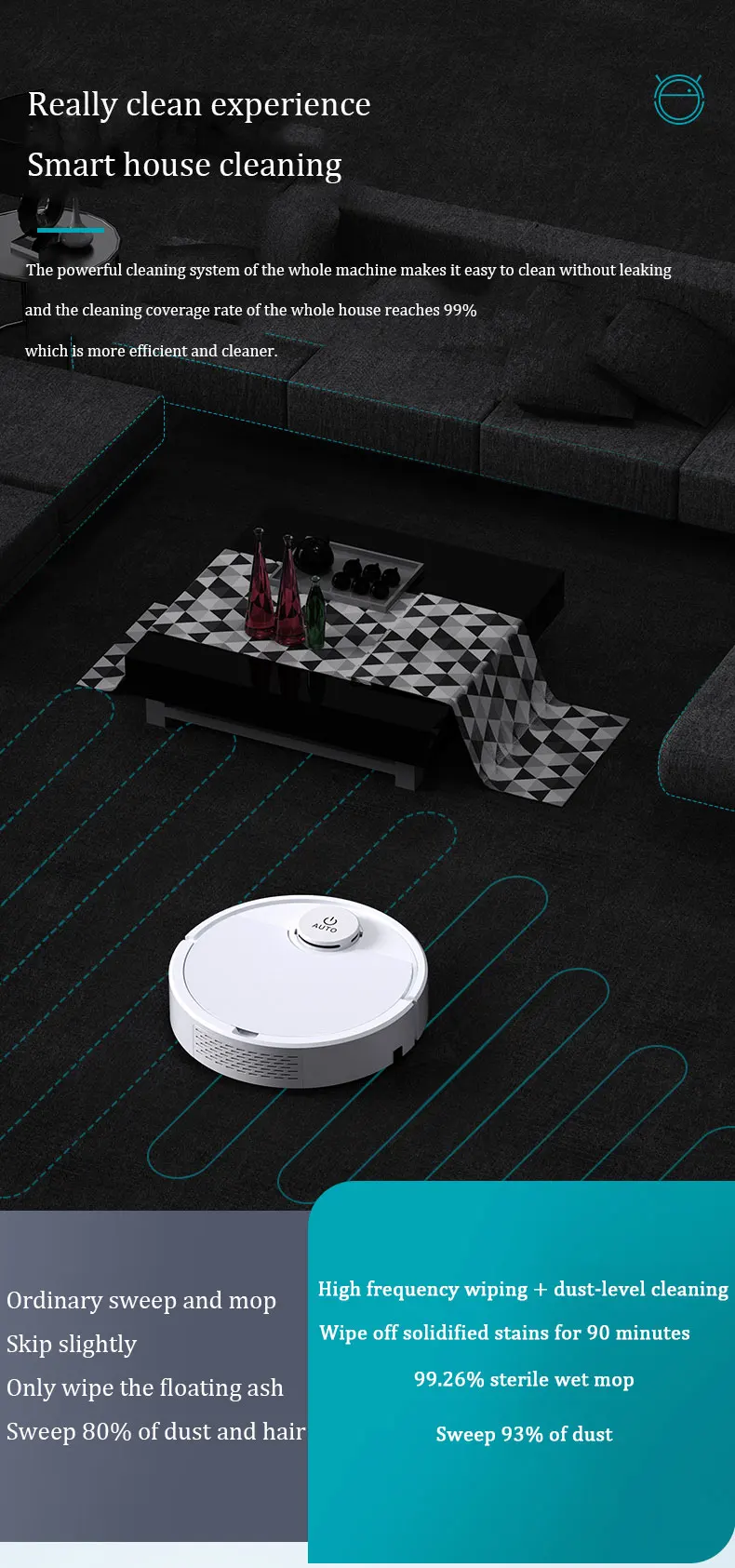 Autonomous planning and cleaning, no running around and high coverage, free shuttle in the complex home environment, reducing missed cleaning and repeated cleaning of the room systematically