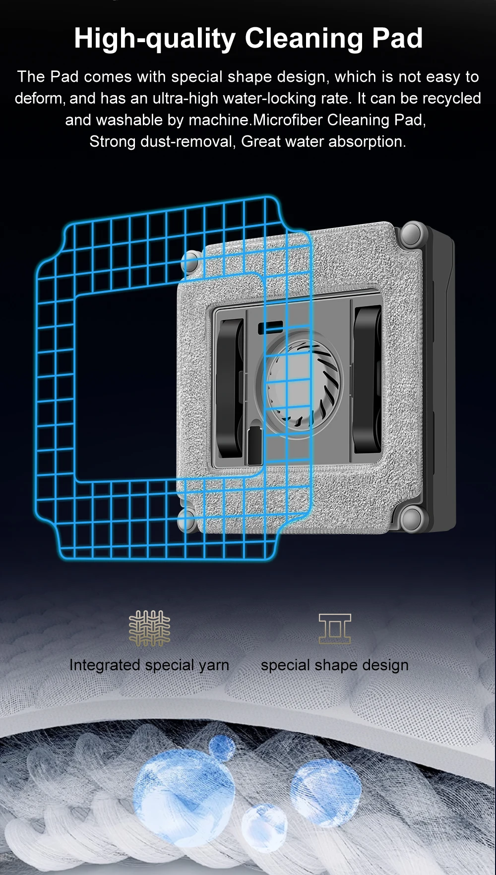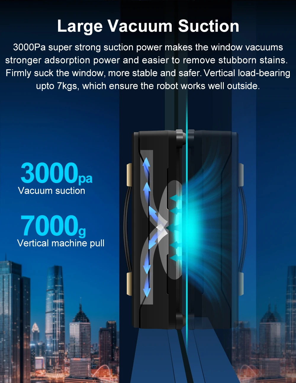 The automatic window cleaner is equipped with a German brushless motor, which increases the service life and reduces noise. 3000Pa super strong suction power makes the window vacuums stronger adsorption power and easier to remove stubborn stains. Firmly suck the window, more stable and safer.