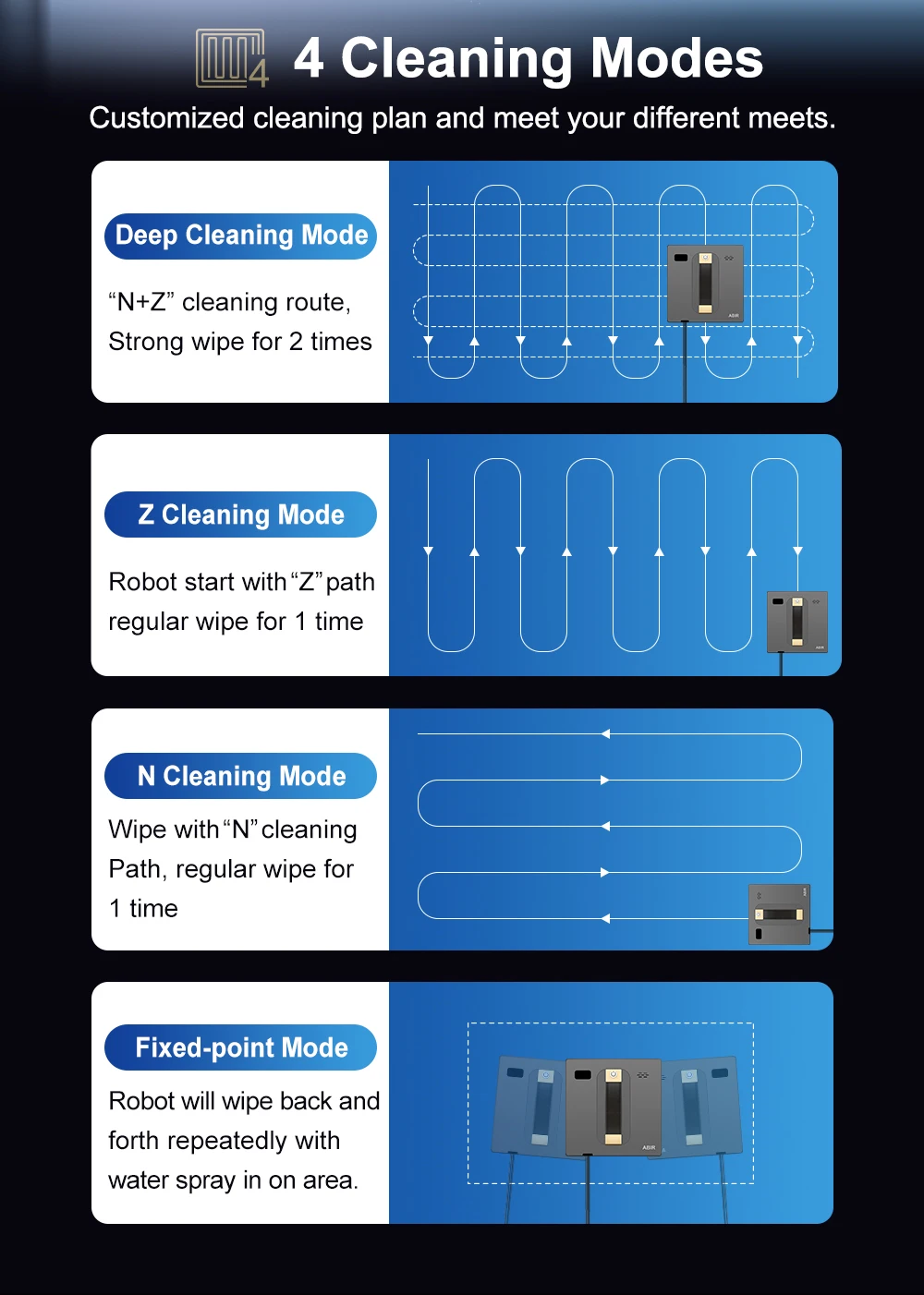Window robot intelligently plans cleaning routes in real time with its advanced SLAM 4.0 system. With the built-in precision sensors of the WD8 window cleaning robot, it can effectively detect edges and quickly adjust its cleaning path within 0.3 seconds. maybe the best window cleaner electric experience you have ever had.