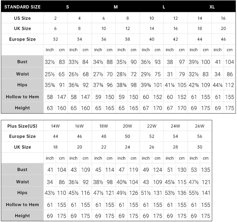 • US16W size : Bust: 43 inches, Waist: 36.25 inches, Hips: 45.5 inches, Hollow to Floor: 61 inches.