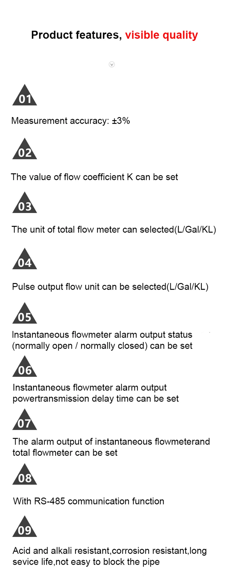 Flow range: DN15(5-150 L/min), DN20(5-150 L/min), DN25(20-280 L/min ), DN50(60-1100 L/min) Error±10%.