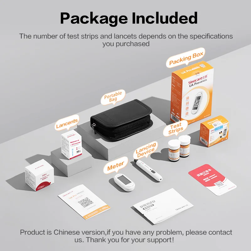 [Meter 100pcs kit]:1*Meter(μmol/L)+1*Portable bag+1*Lancing device+100 Strips +100 Needles