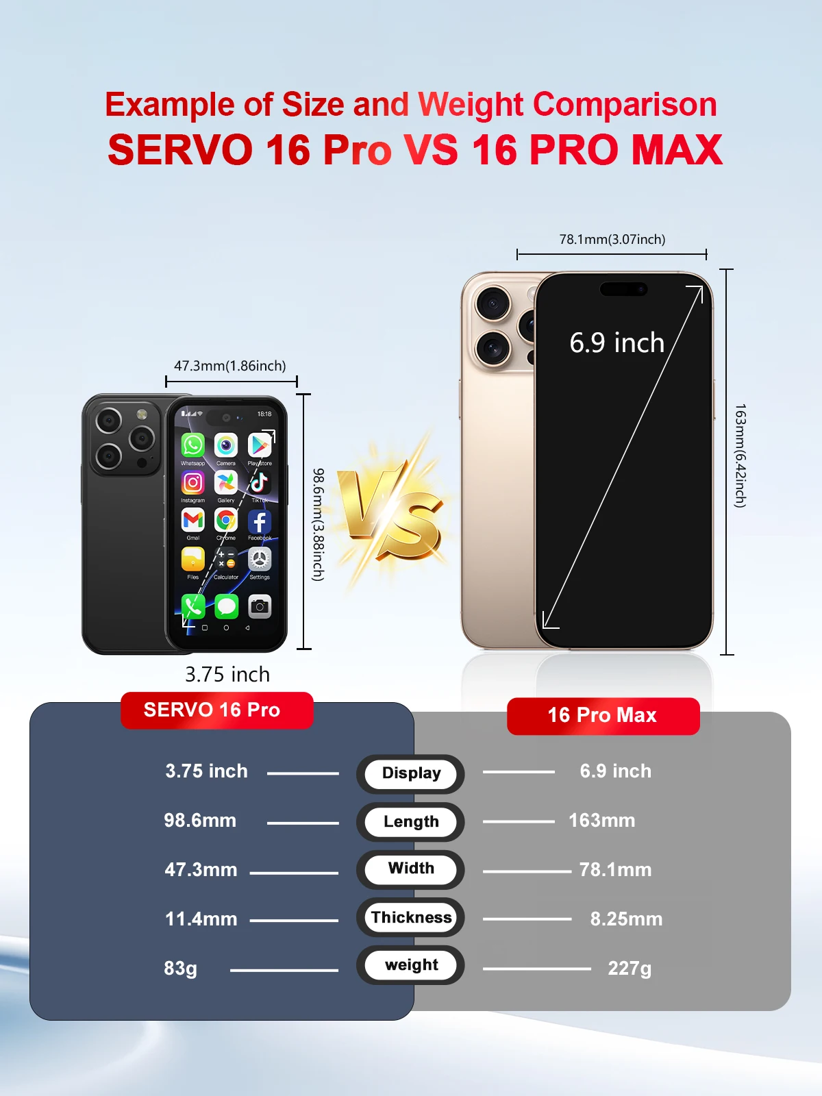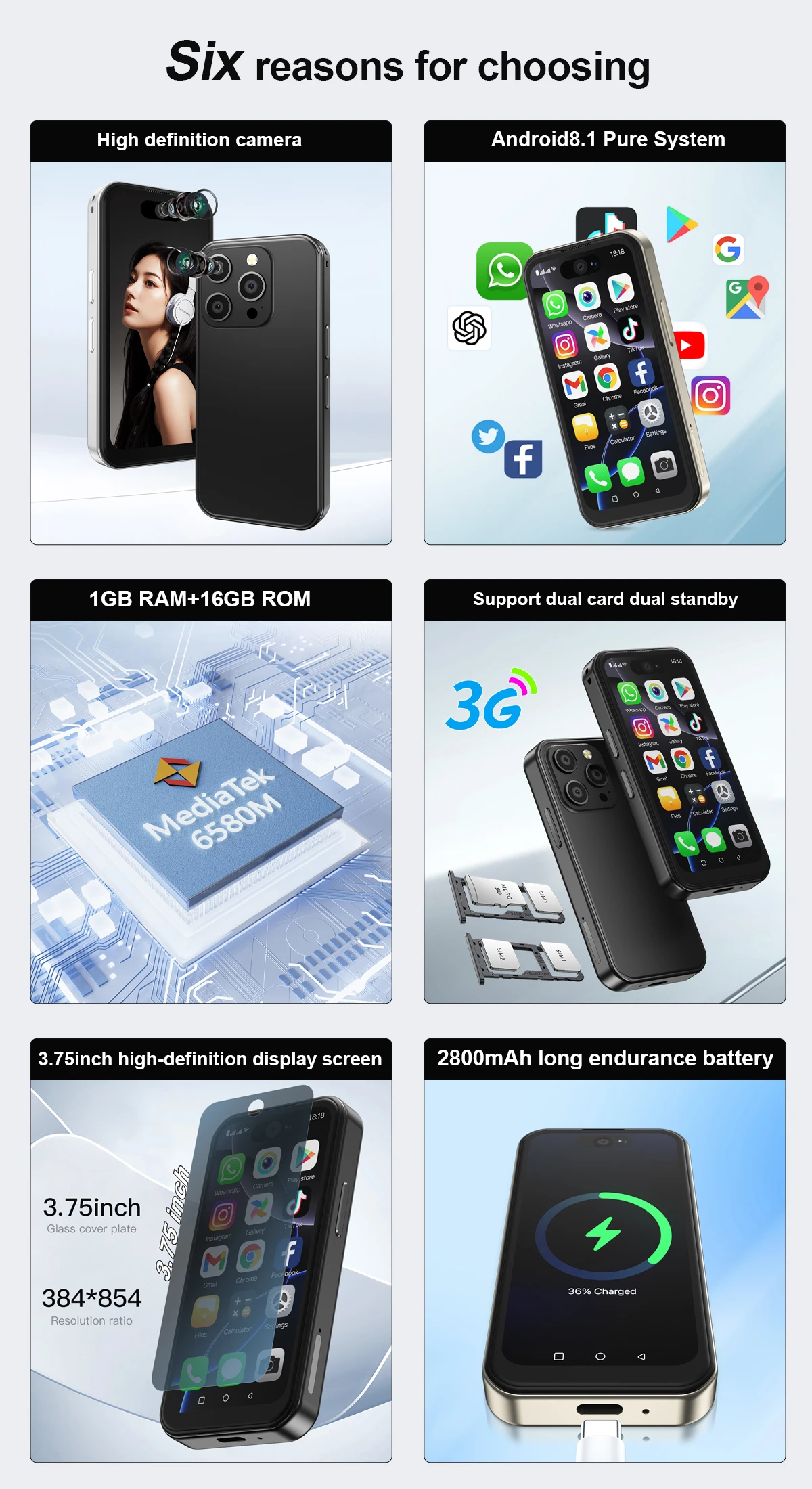 SERVO 16PRO Mini Smartphone 3G WCDMA Dual SIM Android 8.1 16GB ROM WiFi GPS Play Store 3.75″Full Screen Small Pocket Smartphones