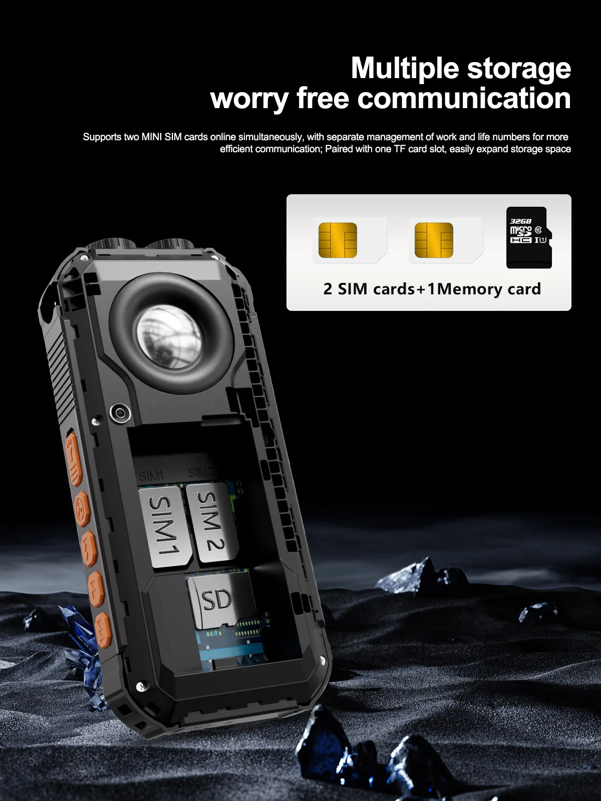 ◆ Memory Card : 32MB RAM , 32MB ROM , Maximum support 32GB expansion (The system will occupy part of the memory,It is recommended to install a memory card before using the phone)