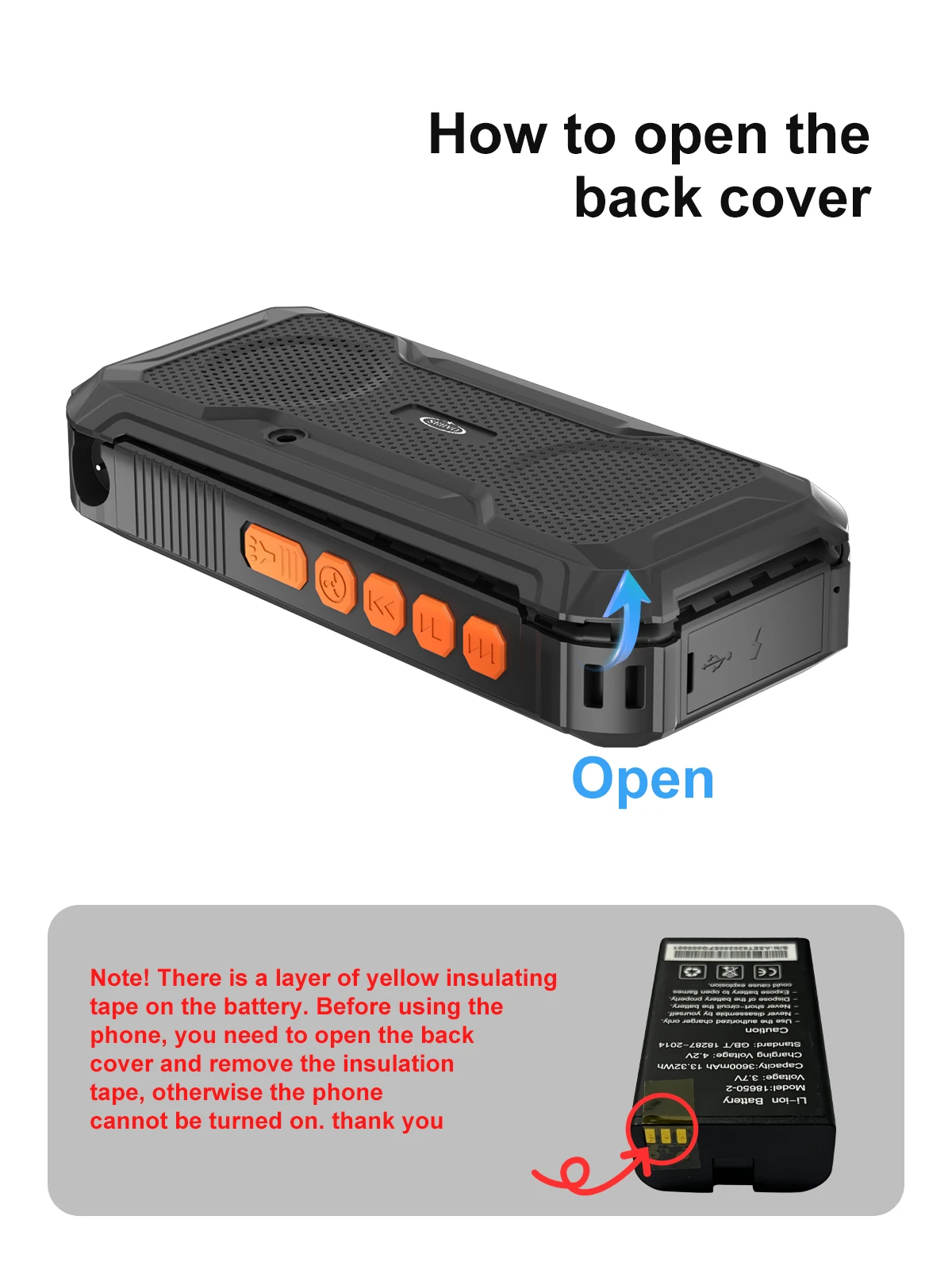 2. There is a layer of insulating tape on the battery of the mobile phone. Before using the phone, you need to open the back cover and remove the insulating tape.